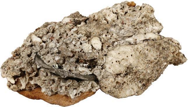 2089. Conglomerate of earthenware shards, ex-Guadalupe and Tolosa (1724). 553 grams total. roughly 5” x 4” x 3”. Larger pieces of pottery with dark surfaces, all tied together with ocean sedimentation in an oblong concretion. FRAGILE - PICK UP IN PERSON ONLY. From Guadalupe and Tolosa (1724), with original certificate from Captain Tracy Bowden through his contract with the Dominican Republic and copy of the article “Graveyard of the Quicksilver Galleons” by Mendel Peterson from the December 1979 issue of National Geographic signed by Bowden. Estimate: $70-$100.