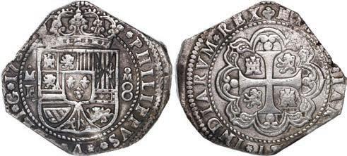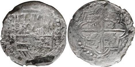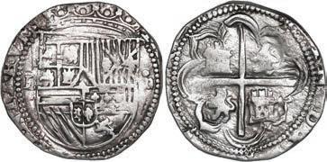 8. SPAIN, Seville, gold cob 2 escudos, Philip II, assayer Gothic D below mintmark S to left, denomination II to right, NGC AU 58. Cal-828; Fr-169. 6.69 grams. Superb full shield and cross and bold full mintmark-assayer and, nearly full crown and much legend including full GRATIA, sharply detailed all over and very lightly toned, actually wear-free but without luster, a good case for quality of strike over grade. NGC #6639283-007. Estimate: $3,000-$4,500.