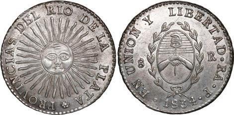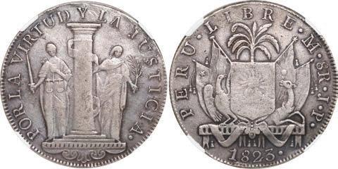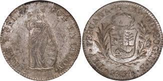 2042. PERU, Lima, 8 reales, 1834 MM, NGC UNC details / cleaned. KM-142.3. Lustrous, boldly struck example of this popular type, some surface hairlines from past cleaning. NGC #6963512-011. Estimate: $150-$225.