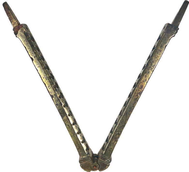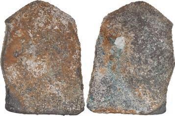 2092. Iron axe head, ex-Guadalupe and Tolosa (1724). 1273 grams. 10” long. Professionally conserved and stable, a hefty piece with dark chocolate coloring all over. From Guadalupe and Tolosa (1724), with original certificate from Captain Tracy Bowden through his contract with the Dominican Republic and copy of the article “Graveyard of the Quicksilver Galleons” by Mendel Peterson from the December 1979 issue of National Geographic signed by Bowden. Estimate: $125-$200.