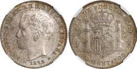 2054. SPAIN, Madrid, gold 100 pesetas, Alfonso XIII, 1897 S-GV, with 18-97 inside six-point stars, NGC MS 60. Cal-119; KM-708; Fr-347. Heavily bagmarked yet lustrous. NGC #4488979-013. Estimate: $2,000-$3,000.