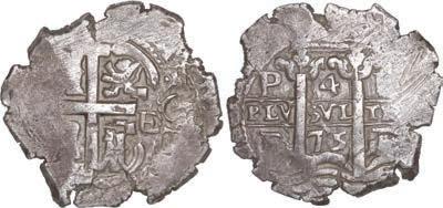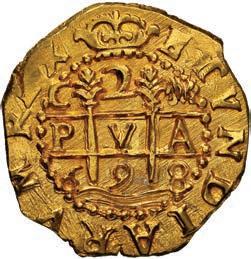 26. SPAIN, Seville, gold cob 2 escudos, Charles II, assayer not visible, obverse struck from 4 escudos die, very rare. Cal-unl (Type 154); Fr-227; KM-211. 6.62 grams. Choice full shield with clear partial denomination IIII to right (possibly unique), also bold full cross with partial date in legend, AU- with spots of dark sediment in crevices. Estimate: $2,000-$3,000.