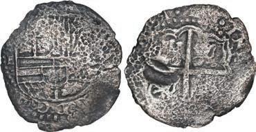 From best to worst, UNC is Uncirculated, AU is Almost Uncirculated, XF is Extra Fine, VF is Very Fine, F is Fine, VG is Very Good, and G is Good, with Fair and Poor below that. (“About” or “A” means the coin is just shy of the indicated grade. Mint State refers to lustrous, choice UNC coins.) We do not always assign numismatic grades to sea-salvage and land-burial coins, which were usually Uncirculated (or close to it) before the effects of corrosion and/or cleaning. Corrosion is usually assessed, from least to most, as follows: none, minimal, light, moderate, and heavy. Also note that we sometimes use the abbreviations E for escudos and R for reales in the listings for Spanish and Spanish colonial items.