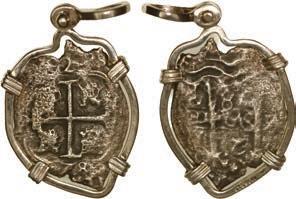 2072. MEXICO, Mexico City, cob 1 real, Philip V, assayer not visible (J), style of 1712-13, ex-1715 Fleet, ex-Volker, mounted cross-side out in silver pendant with fixed bail. 4.76 grams total. Nice little piece with weak yet full cross, some shield detail also visible. From the 1715 Fleet, with certificate from salvor Roy Volker (photocopy). SOLD FOR THE BENEFIT OF THE 1715 FLEET SOCIETY. Estimate: $150-$225.