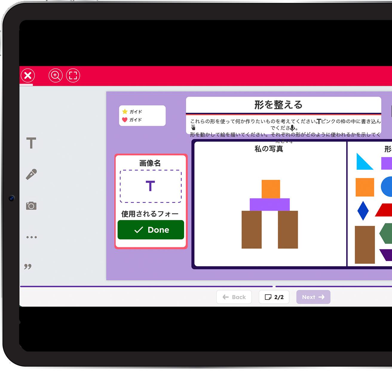 お絵かき(描画)機能を使う と、子どもたちは考えや理解 を「見える形」で伝えられま す。iPad の直感的なタッチ操 作は、自由に表現するための最 適なキャンバスになります。