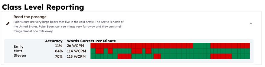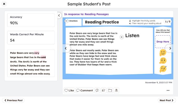 • Reading Fluency Assessment Tools: The Reading Fluency assessment tool allows teachers to automatically capture key metrics and actionable insights from student voice recordings.