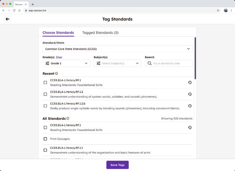 With site-wide standards and new learning insights dashboards*, schools and districts can support standards-based grading in Seeaw and monitor progress against standards.