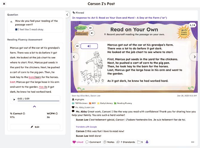 Family Engagement: Engage families in the learning process through accessible two-way communication with text translation options in 100+ languages. Families gain insight into their student’s work and see learning made visible.
