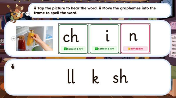 Formative Assessment Drag and Drop Practice Mode, using phoneme frames, provides pupils with immediate feedback on their segmenting practice.