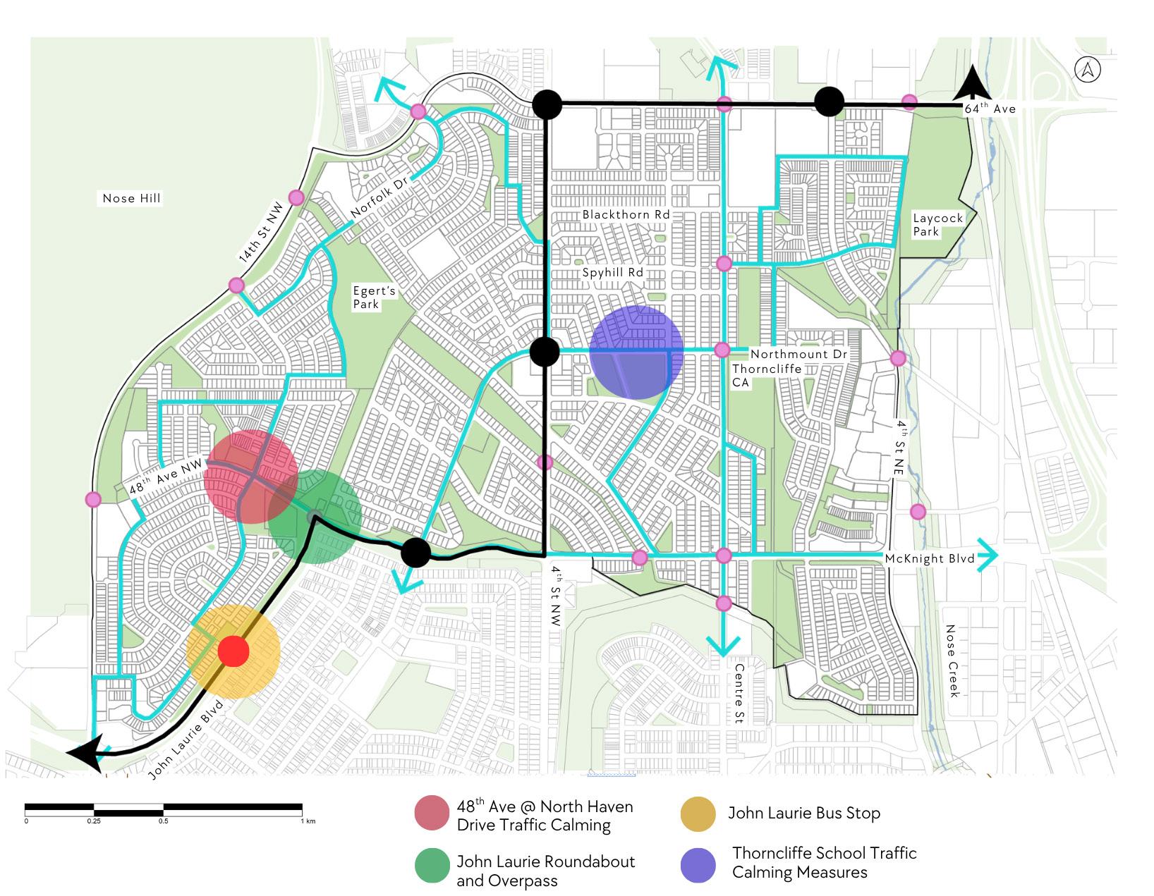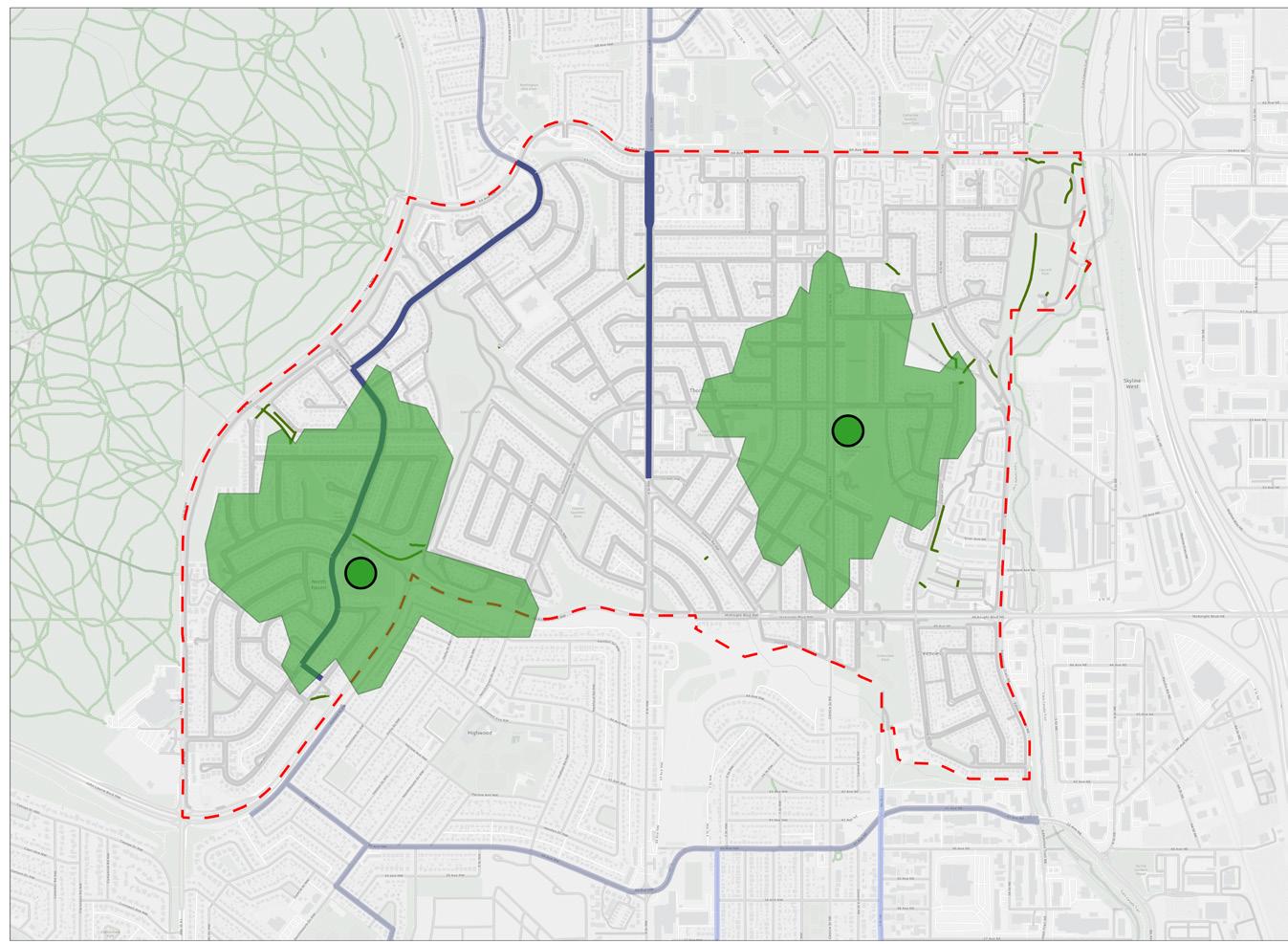 The communities of Thorncliffe / Greenview - North Haven currently stand at a crossroads. The three communities were conceived in the early 1960 / 1970’s and are inner-city communities. While there are a variety of road typologies, lack of upgrades to existing infrastructure has caused traffic congestion, safety concerns in school zones, and lack of east-west connections, mainly due to the natural and man-made barriers within the community. To help reconcile that, a plan to address the key concerns of the community was created. Through an initial research and analysis phase, two community engagements, and four steering committee presentations, this plan was put forward to help bring the three communities into the modern era.