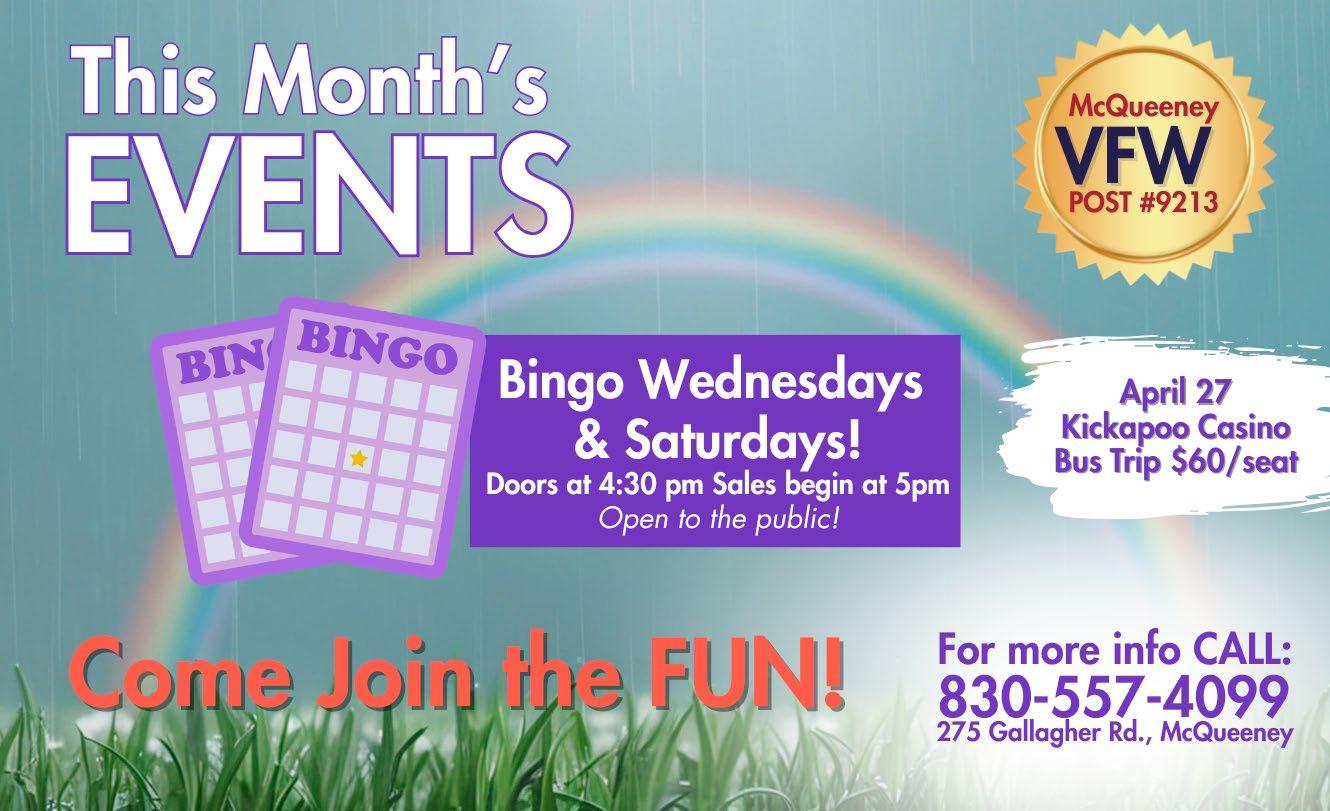 To promote your event on this page contact advertising at 830-379-2234 or email communitycalendar@kwed1580.com
