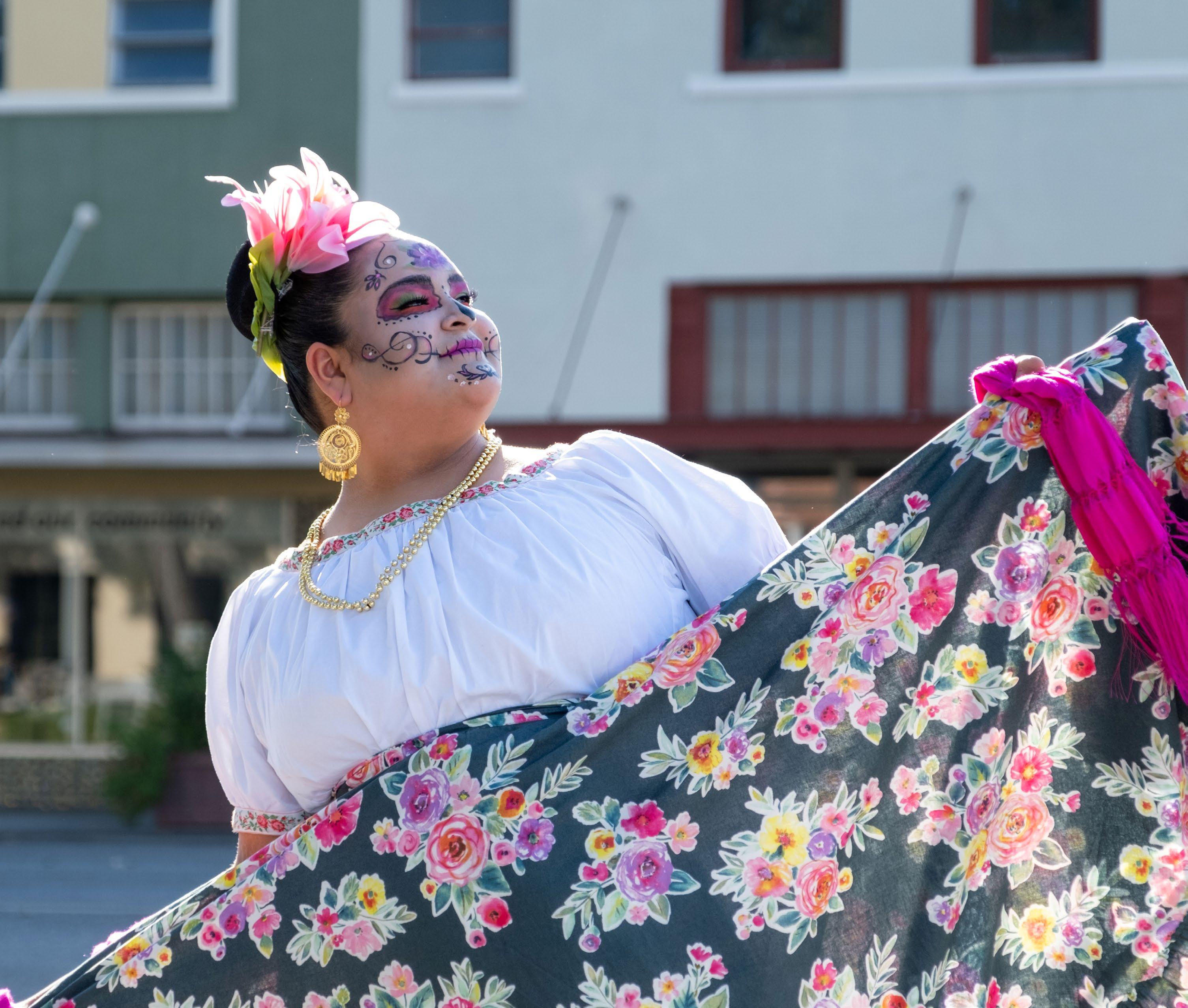 Teatro De Artes student, Halen Barrientos wears her Tabasco vestuario with Calaveras makeup for Dia De Los Muertos in downtown Seguin. Makeup by Deanna Barrientos.