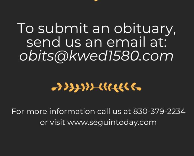 You are invited to sign the guest book at www.treshewell.com. Arrangements are under the direction of Tres Hewell Mortuary, 165 Tor Dr., Seguin, Texas, 78155, 830-549-5912.