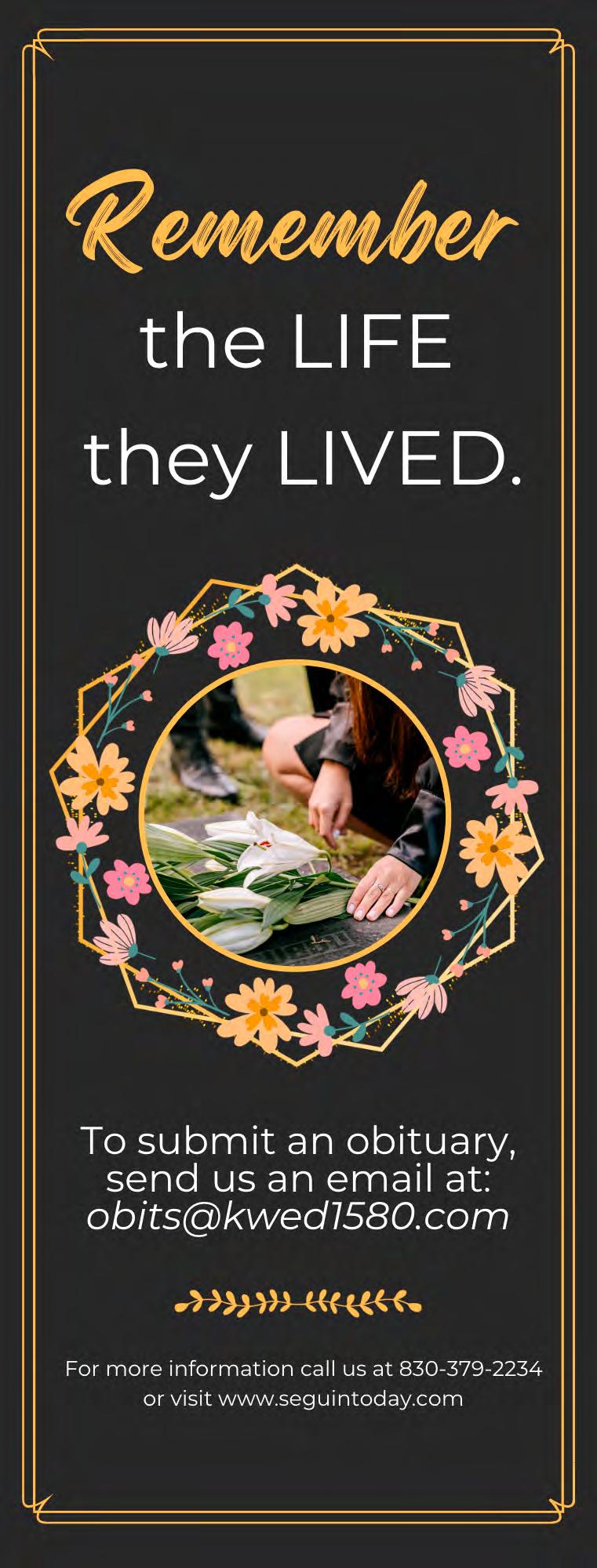 www.SEGUINTODAY.com TUE. MARCH 28, 2023 17 CLASSIFIEDS Place your ad in the CLASSIFIEDS by visiting the KWED office located at 609 E. Court St. during regular business hours. Or call us at 830-379-2234 Seguin Daily News Vital Statistics continued on the next page. Need Office Space? As low as $75/month www.riseseguin.com