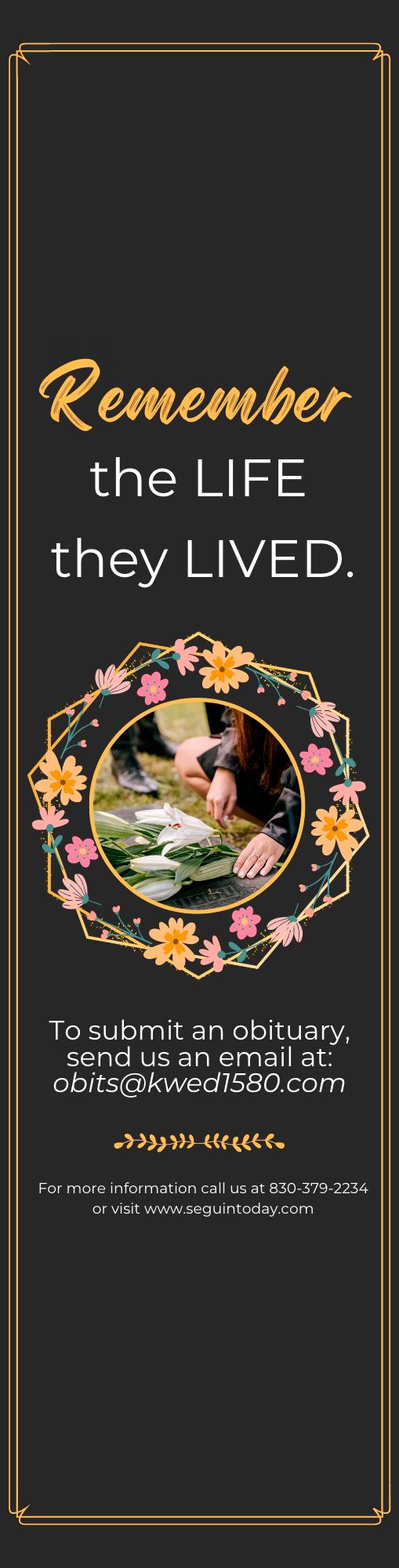 You are invited to sign the guest book at www.treshewell.com. Arrangements are under the direction of Tres Hewell Mortuary, 165 Tor Dr., Seguin, Texas, 78155, 830-549-5912.