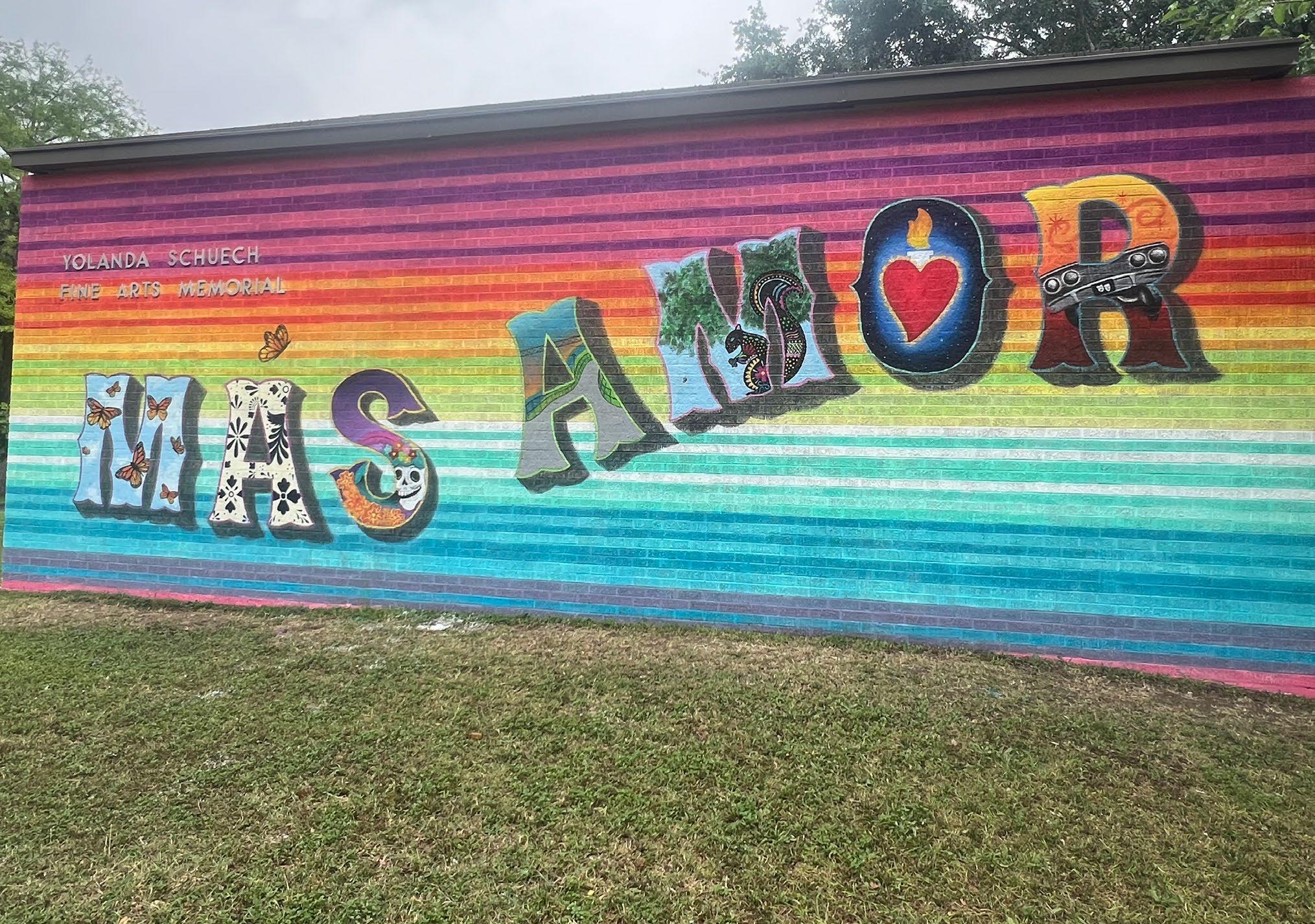 Passerby’s or visitors to Texas Lutheran University are invited to get a look at the mural on the south wall of the Schuech Fine Arts Center located just off of Prexy Drive. The mural created by local artist/muralist Danielle Villareal serves as a visual metaphor depicting the cultural bridge between TLU and the city of Seguin.