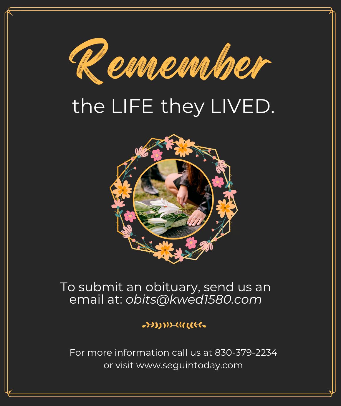 Graveside services and interment will be held on Monday, July 3, 2023, at 10 A.M. at San Geronimo Cemetery in Seguin. Followed by a reception at First Methodist Church in Hierholzer Hall in Seguin.