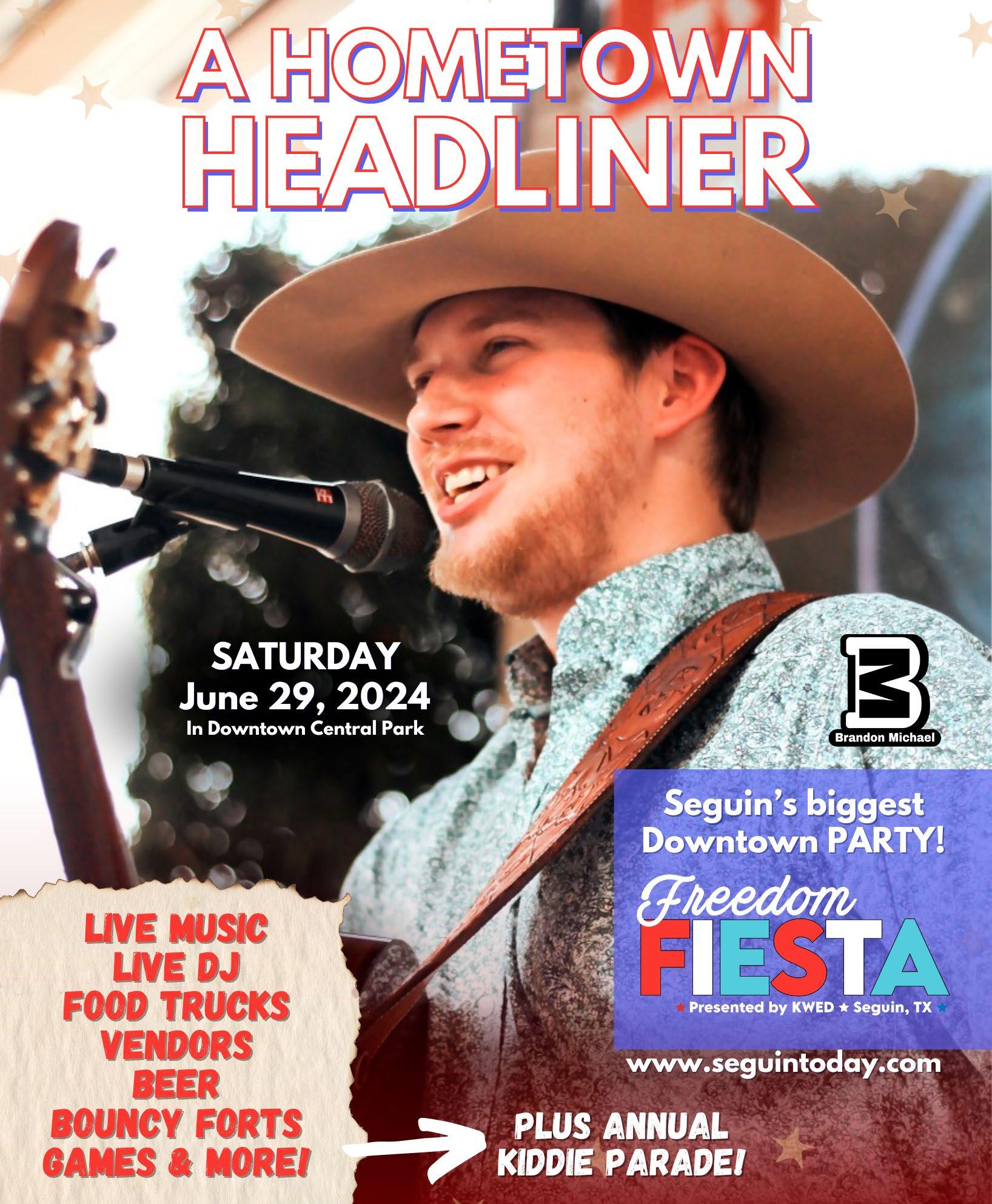 Freedom Fiesta presented by KWED will be held from 6 to 11 p.m. Saturday, June 29 in Central Park in downtown Seguin. There will be entertainment provided by Brandon Michael and D.J. DTrayne. There will also be a variety of food trucks, non-profit food vendors, other vendors, cold drinks, and time to connect with the community. For more information call 830-379-2234.