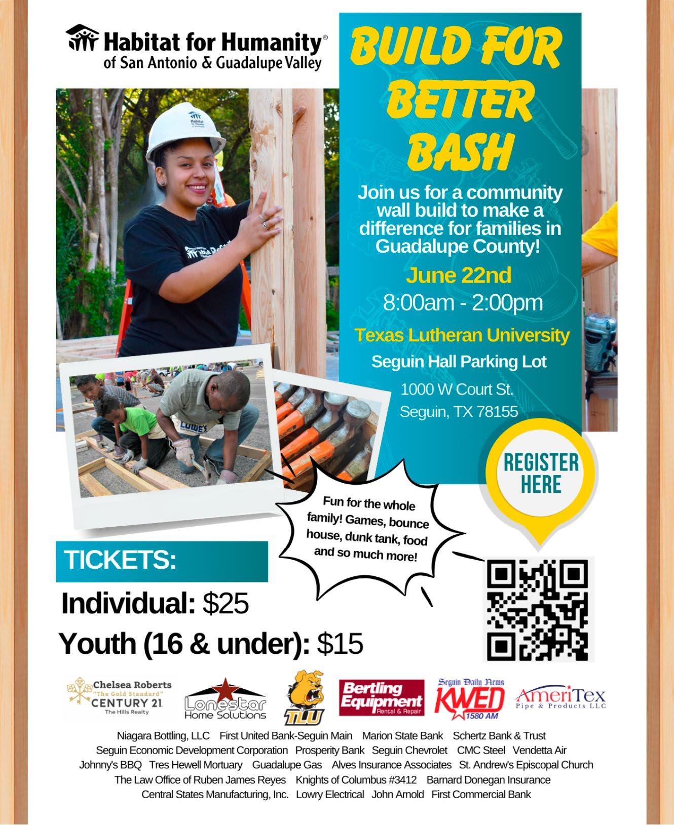 The Guadalupe Valley Habitat For Humanity will have a Build for Better Bash from 8 a.m. to 2 p.m. on Saturday, June 22 in the Seguin Hall parking lot on the campus of Texas Lutheran University, located at 1000 W. Court St. in Seguin. Tickets include a meal, ticket, and t-shirt and are $25 for individual and $15 for youth (16 & under). To purchase tickets visit https://lp.constantcontactpages.com/ ev/reg/fgdzx77/lp/747ccb91-2f4c-4281-ae713939d63ff32f. For more information, call 830-4010422.