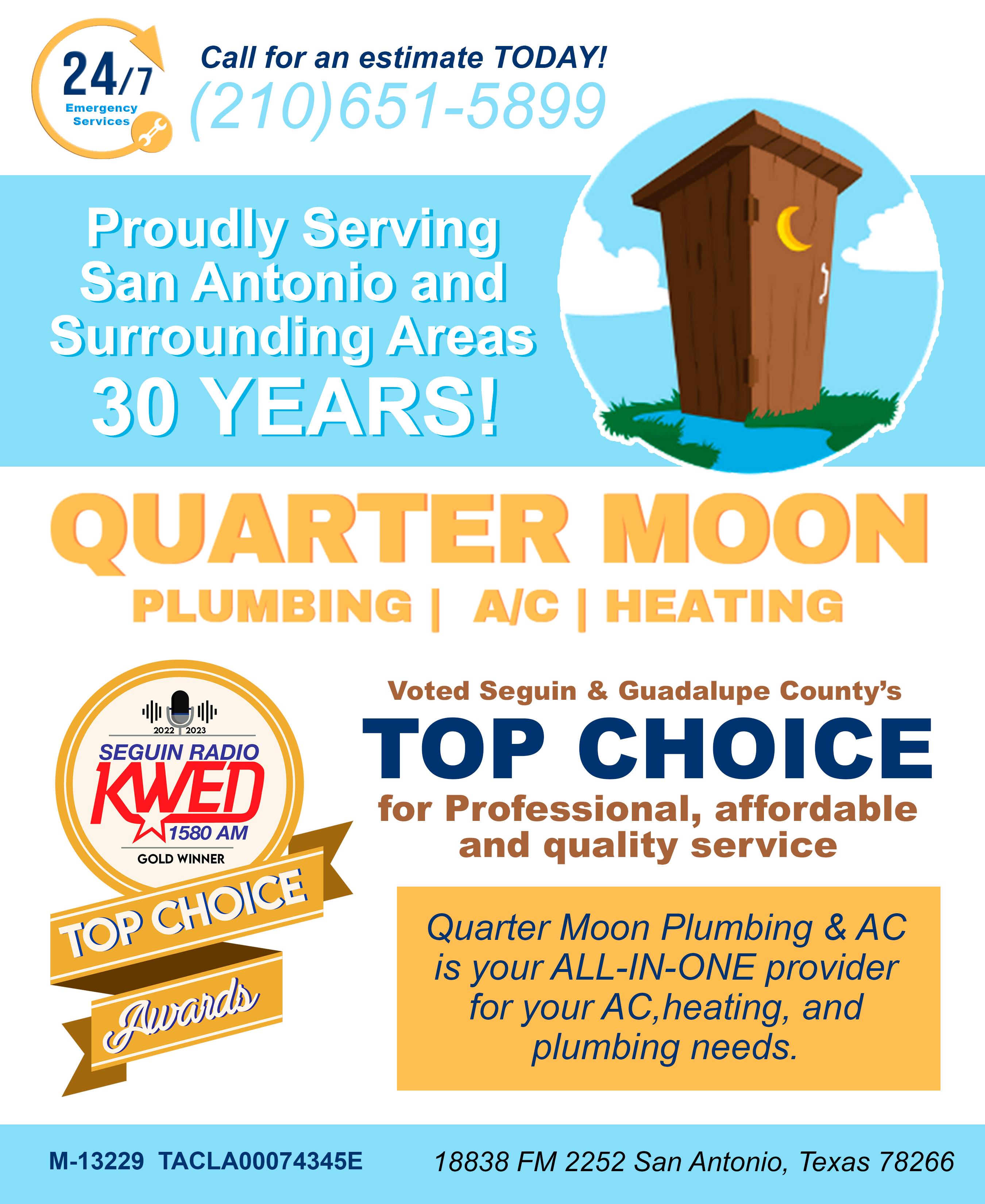 www.SEGUINTODAY.com FRI. JULY 28, 2023 10 ML#11807 101 Ermel, Street Seguin, Texas 78155 Commercial and Residential Plumbing SEGUIN: 830-379-8624 NEW BRAUNFELS: 830-629-1757 www.a1tricountyplumbing.com a1trico@yahoo.com SAN MARCOS: 512-353-8656 TOLL FREE: 1-877-WET-LEAK FOR MORE THAN 35 YEARS! A-1 Tri County Plumbing, Inc. 24/7, 365 DAYS A YEAR Offering: High Pressure Jetting, Non-Invasive Leak Detection, Stoppages, Water Heaters, Backflow Preventer Services, Slab Leaks, Pipe Winterizing, RePipes, Hard Water Solutions, Sewer Lines, Pre-Paid Service Agreements, Plumbing Emergencies and more!