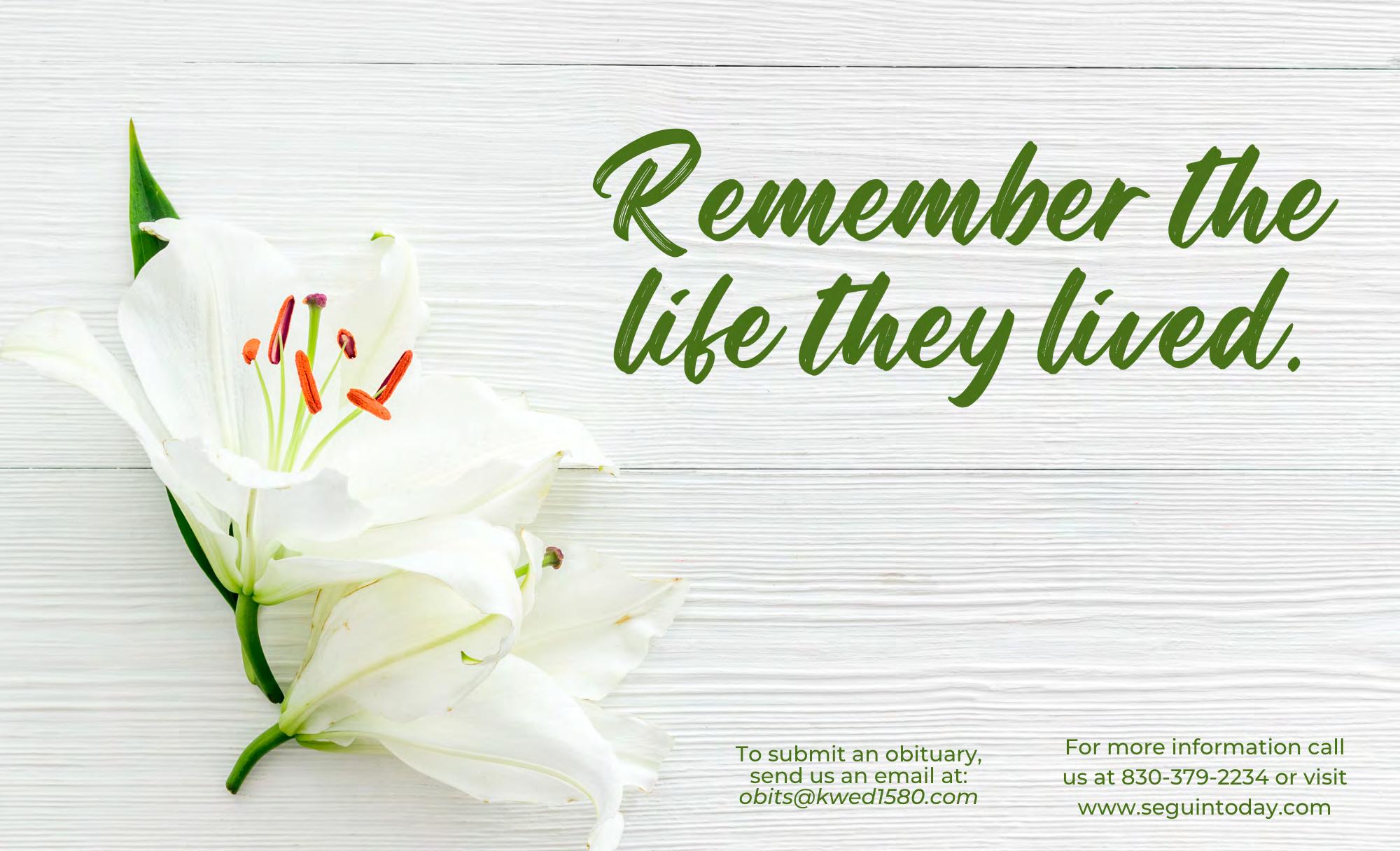 You are invited to sign the guestbook at www.treshewell.com. Arrangements are under the direction of Tres Hewell Mortuary, 165 Tor Dr., Seguin, Texas, 78155, 830-549-5912.