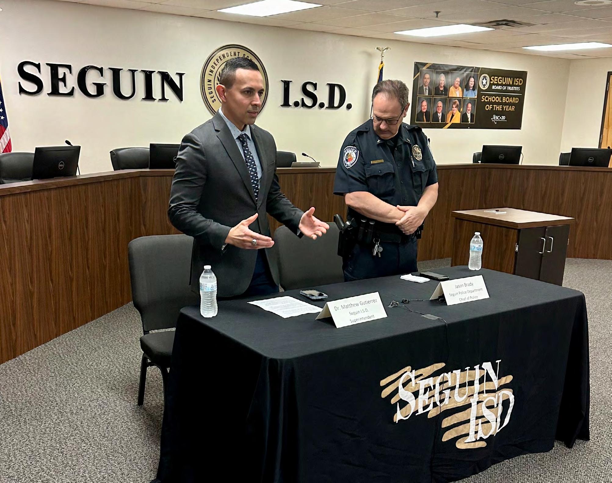 Seguin ISD Superintendent Matthew Gutierrez and Seguin Police Chief Jason Brady prepare to answer questions during a press conference on Tuesday afternoon at the Seguin ISD Administration Building.