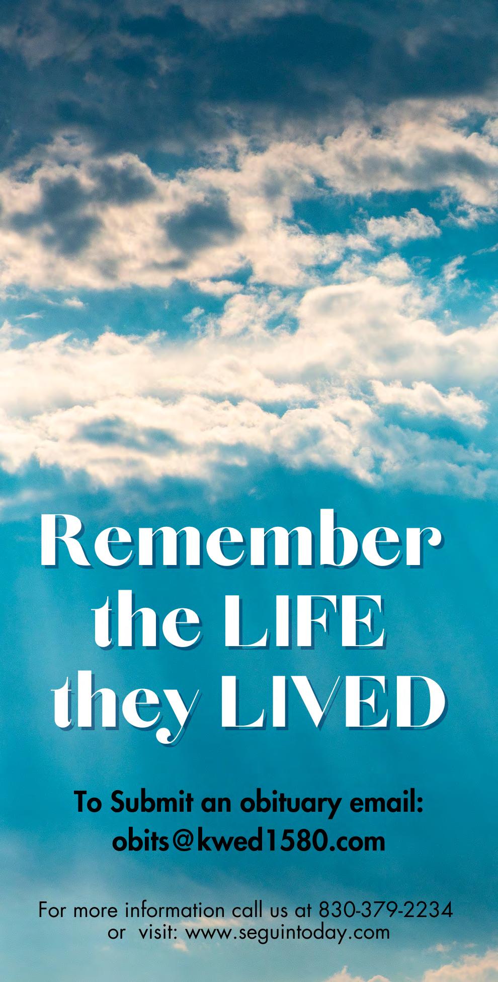 Funeral arrangements are under the care of Palmer Mortuary and Cremations located at 1116 N. Austin Street, Seguin, Texas 78155; 830.379.9430. Please log on to www. palmermortuary.com to sign and view the guest book.