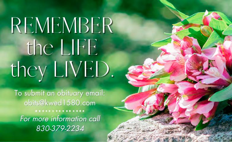 Memorial contributions may be made to the charity of one’s choice. You are invited to sign the guest book at www.tresehwell.com. Arrangements are under the direction of Tres Hewell Mortuary, 165 Tor Dr., Seguin, Texas, 78155, 830-549-5912.