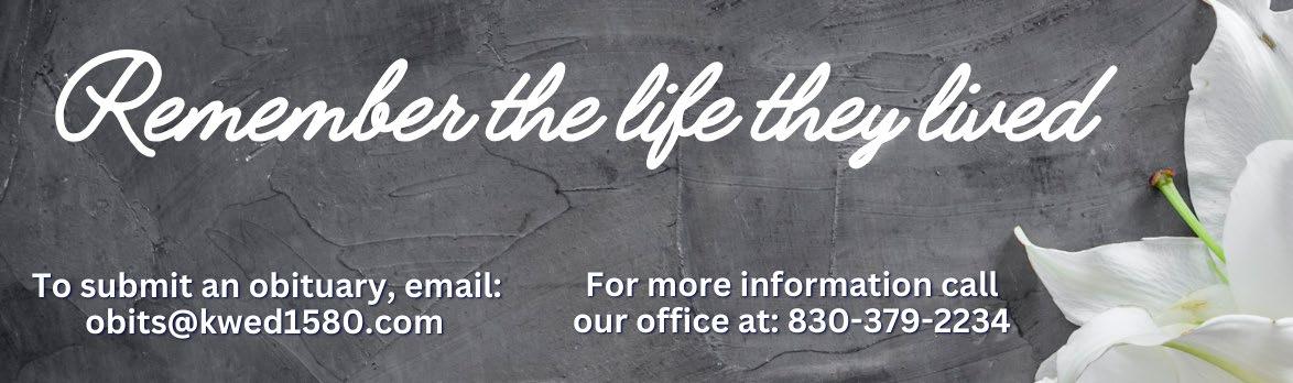 In lieu of flowers, memorial contributions can be made to the Spirit of Joy Lutheran Church, 416 Dolle Avenue, Seguin, Texas, 78155 or a charity of your choice.