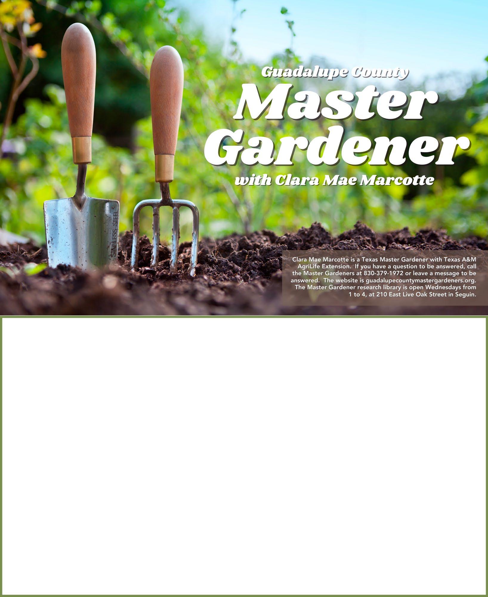 The Guadalupe County Master Gardeners will be available for answering all your gardening questions and give expert advice from 9 to 11 a.m. on Saturdays in Sept. and Oct. at the Big Red Barn, located at 390 Cordova Rd. They will not be available on Saturday, Oct. 12.