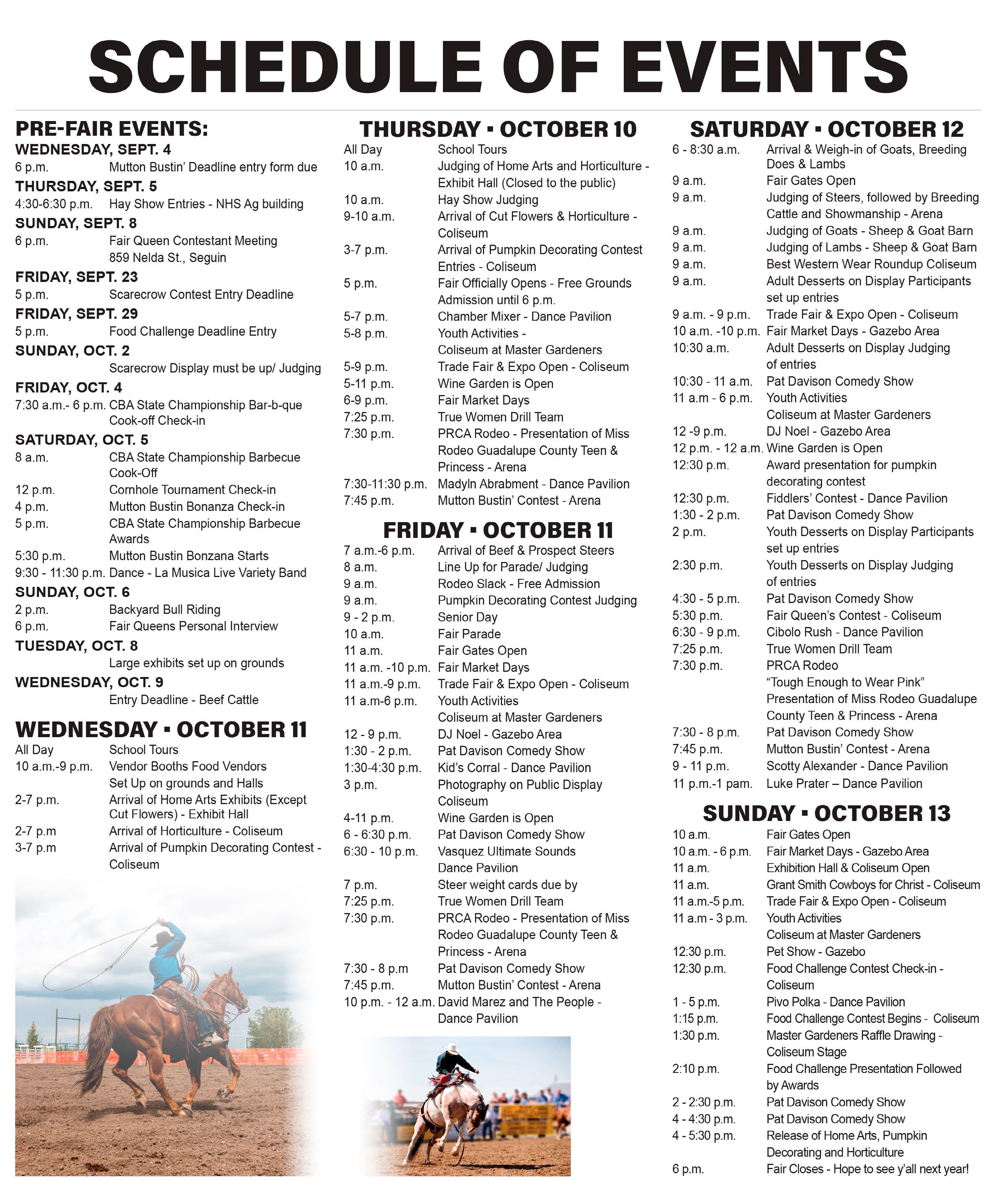 A complete listing of events and other prices and discounts can be found in the official fair catalog available for pickup at Seguin Radio KWED or online at gcfair.org .