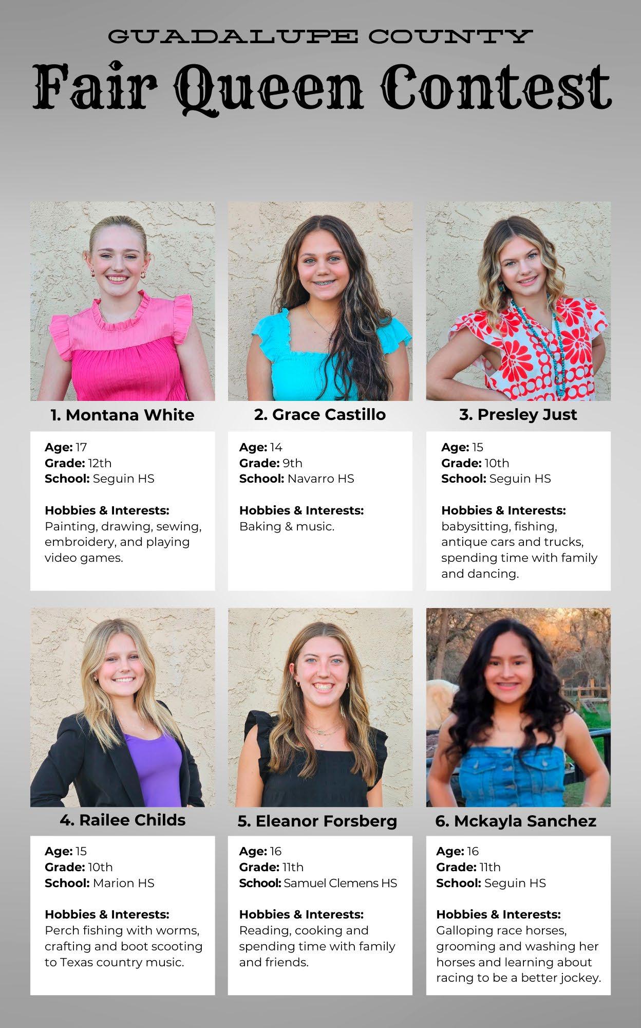 The 74th annual Queen’s Contest gets underway this Saturday at 5:30 p.m. in the Seguin Coliseum. Six contestants will be vying for the crown. The community is encouraged to come out and watch the stage portion of the contest. The event is free.
