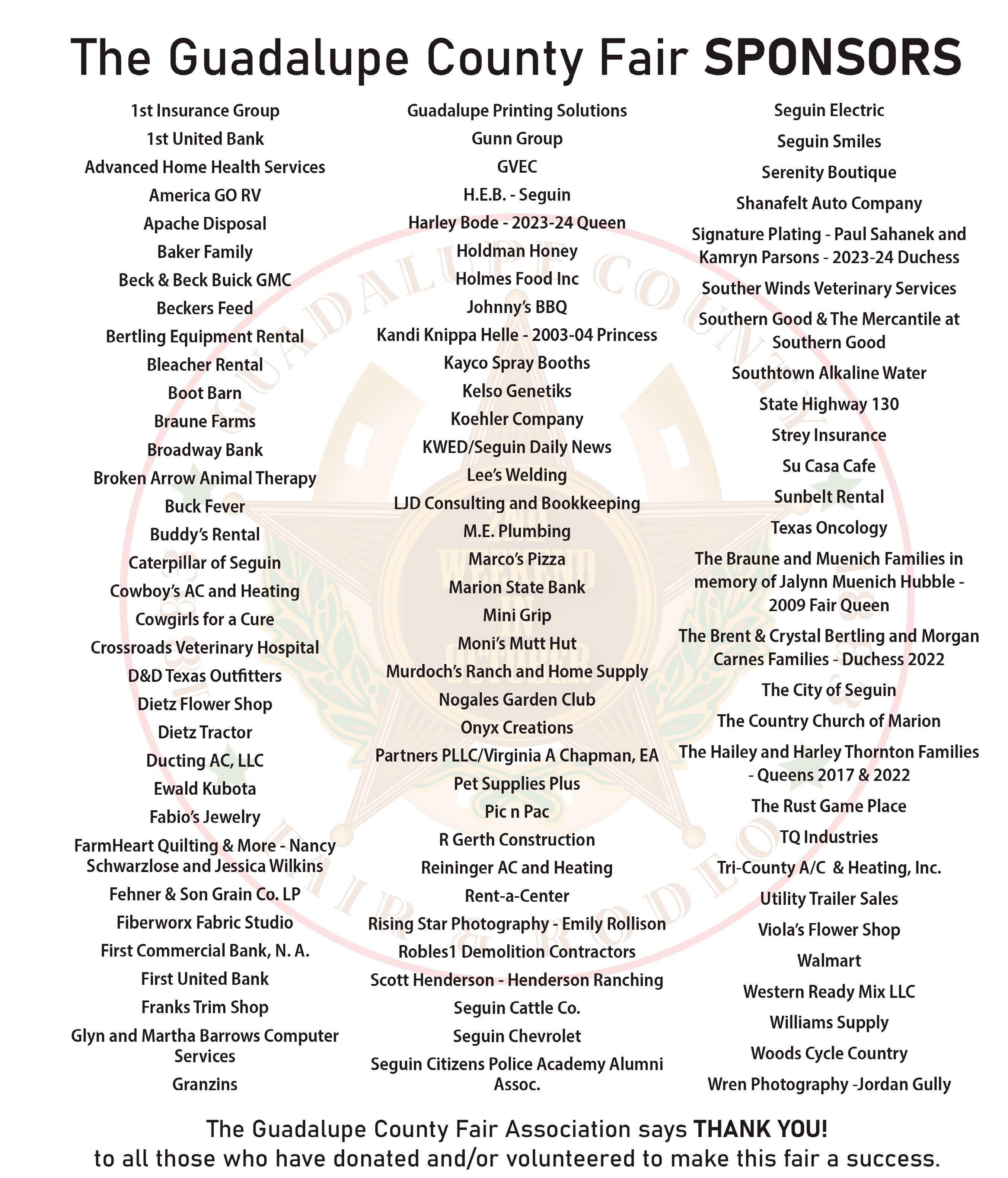 The Guadalupe County Fair is seeking more volunteer members. Also seeking to partner with businesses or organizations for volunteers during the Fair. Needed areas include the rodeo ticket admissions and food and beverage ticket sales. For volunteer member applications or to register your business or organization to volunteer, visit www.gcfair.org or call 830-379-6477. Save the date for the Guadalupe County Fair on Oct. 10 - 13 at the Seguin Events Complex. Follow the fair on Facebook and Instagram @GuadalupeCo.FairAssociation.