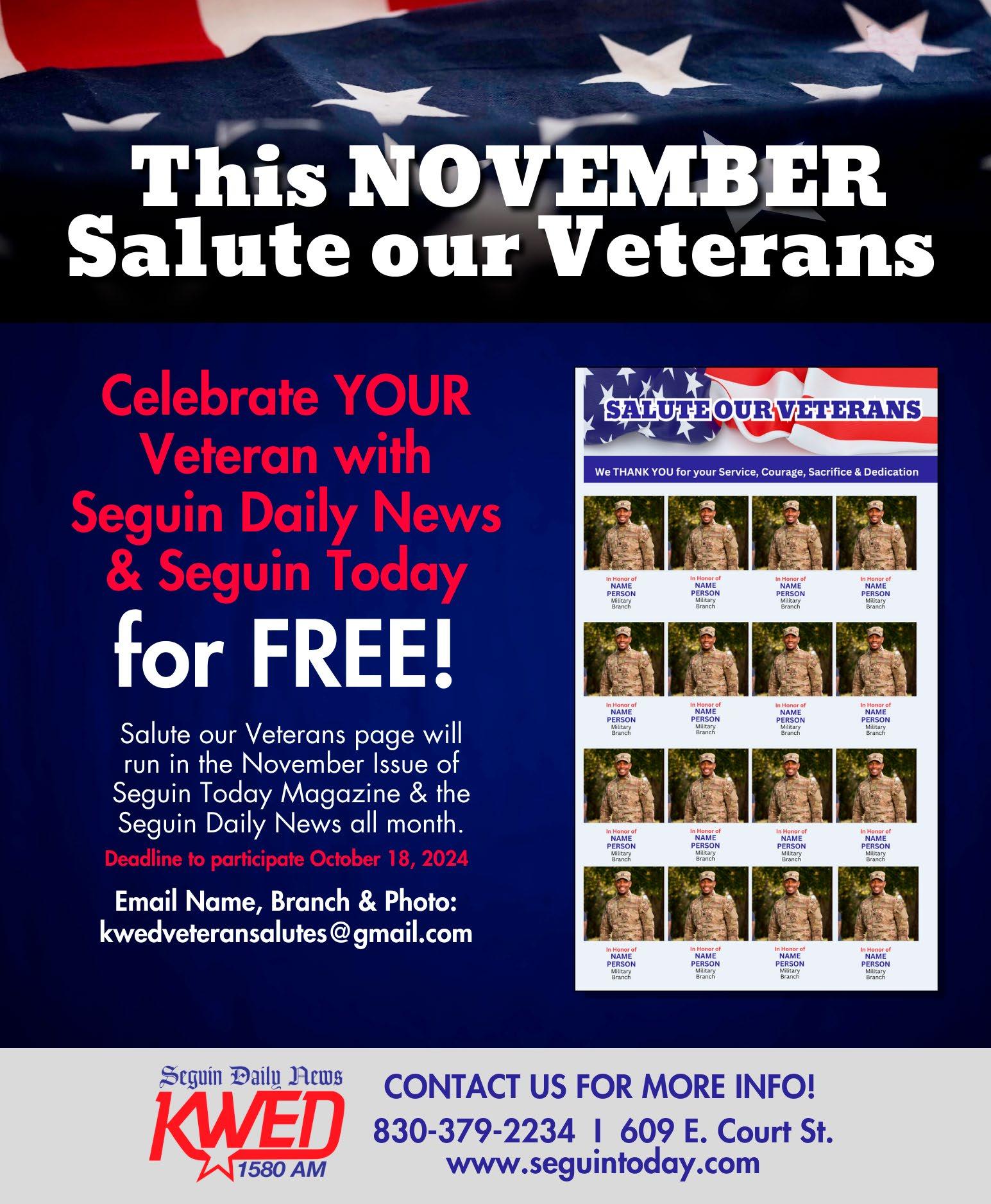 Texas Lutheran University will have its 2nd Annual Dia De Los Veteranos from 3 to 7 p.m. on Saturday, Nov. 23 in the Langner Hall parking lot, located at 1000 W. Court St. in Seguin. There will be a car show & shine, free food and drinks, TLU Mariachi performance, live graffiti art, photo booth, moon bounce, vendor market, book reading and signing and music by Dj Chuko. There is no registration fee for the car show and check in is from 10 a.m. to 2 p.m. For more information, call 830372-6073.