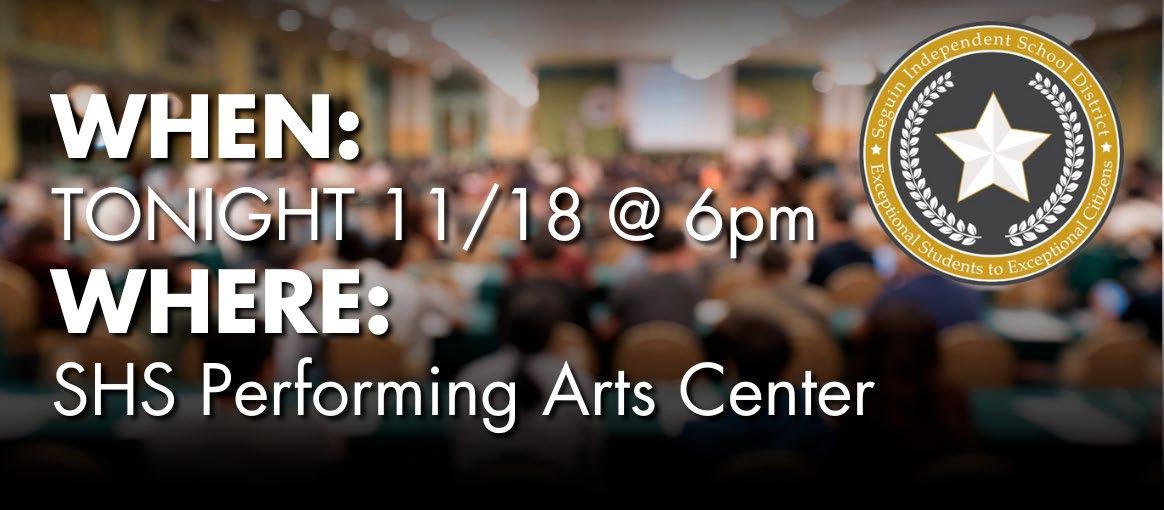 The town meeting gets underway at 6 p.m. today in the Seguin High School Performing Arts Center located at 1315 E. Cedar St.