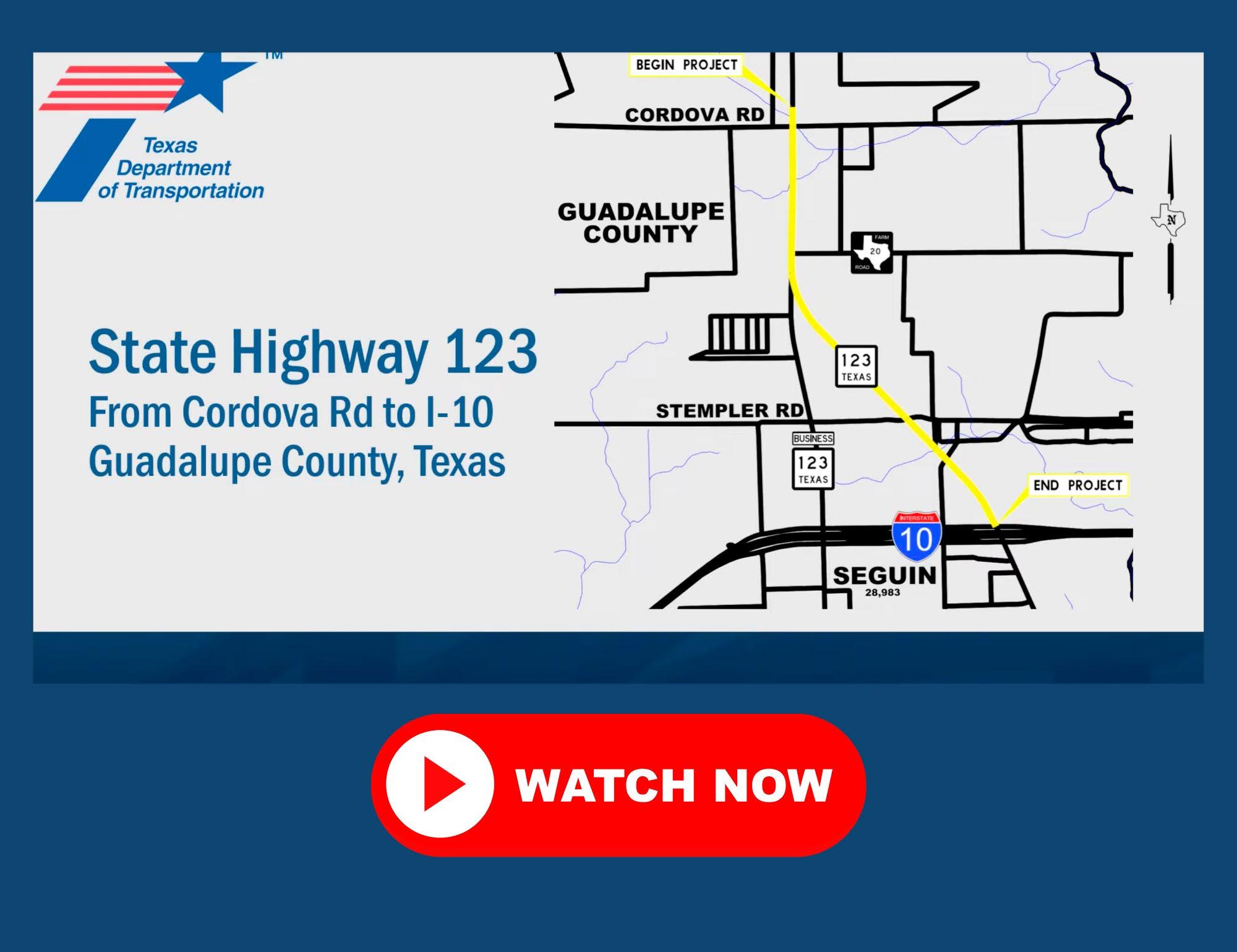 “TxDOT is planning to widen State Highway 123 in Seguin. The project will expand the roadway from two lanes to four lanes. So, the planned improvements will take place on State Highway 123 between Cordova Road and I-10, commonly referred to State Highway 123 Bypass North,” said Brown.
