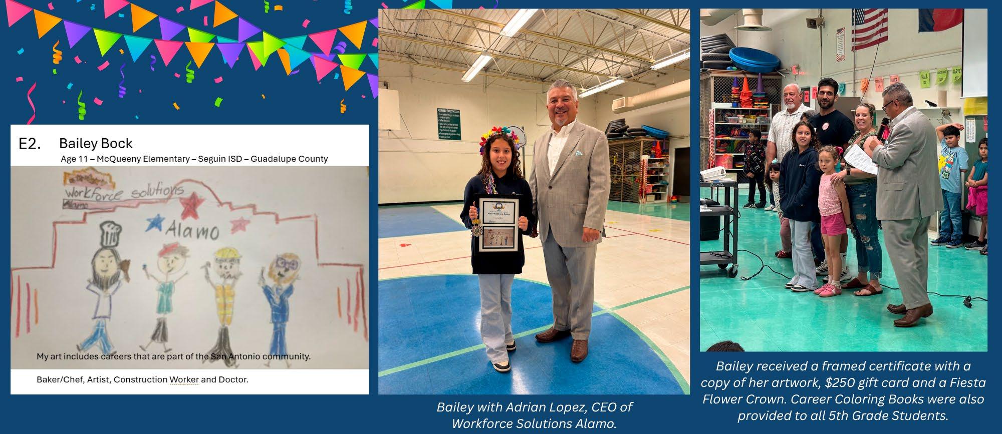 Workforce Solutions Alamo recognized her achievement and presented her with a $250 gift card for winning the top elementary school honor. The overall winning student artist for the contest received a $500 award and was recognized as the official designer of the 2026 Workforce Solutions Alamo Fiesta Medal. In addition to Bailey’s elementary category win, top middle school submissions also received a $250 gift card.