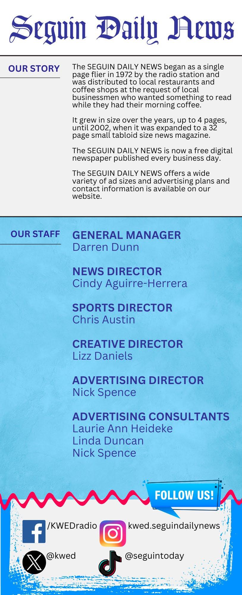 The Seguin Heritage Museum is inviting the community to “An Evening with the Texas Rangers,” a special program featuring history and live entertainment. The event will be held from 6 to 9 p.m. Thursday, April 30 at the Palace Theatre, located at 114 S. Austin St. in Seguin. Entertainment will be provided by Dottsy Dwyer and the Hudiburgs, with concessions available during the evening. Admission is $20. Tickets can be purchased online at seguinheritagemuseum. org or locally at the Seguin Heritage Museum, Parker’s City Pharmacy, and Gift and Gourmet.