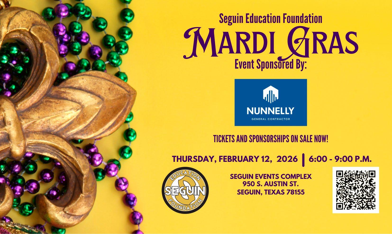 Enjoy an evening of great food, games, and giving at Mardi Gras 2026 on Thursday, February 12, 2026, starting at 6 p.m. in the Seguin Coliseum, located at 950 South Austin Street. The event features food from Burnt Bean Co., interactive games, prize opportunities, and fundraising in support of a Fund-a-Need recipient to be announced soon. Tickets and sponsorships are limited and selling fast. Purchase tickents online at https:// seguineducationfoundation.betterworld.org/events/seguin-education-foundation-mard-3#tickets-form.