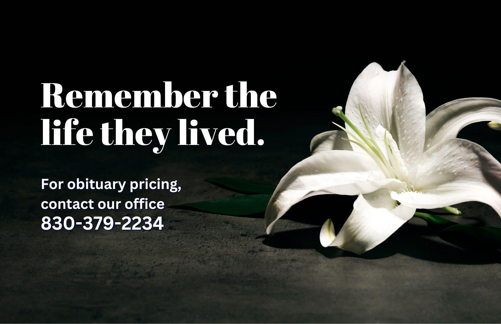Memorial contributions may be made to Cherokee Home for Children, 13355 TX-16, Cherokee, Texas, 76832, or Guadalupe Regional Medical Center Hospice Services, 1215 E. Court St., Seguin, Texas, 78155.