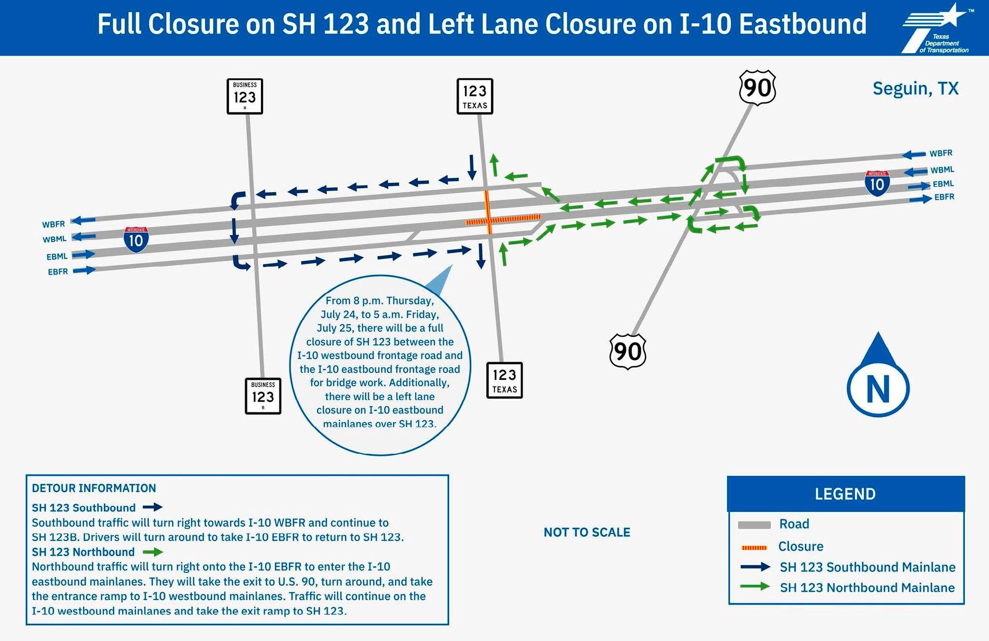 ALERT: A full closure of SH 123 between the I-10 Westbound and Eastbound Frontage Roads is scheduled from 8 p.m. Thursday, July 24, to 5 a.m. Friday, July 25, for bridge work. The left lane of I-10 Eastbound over SH 123 will also be closed. Drivers are urged to plan ahead and seek alternate routes.