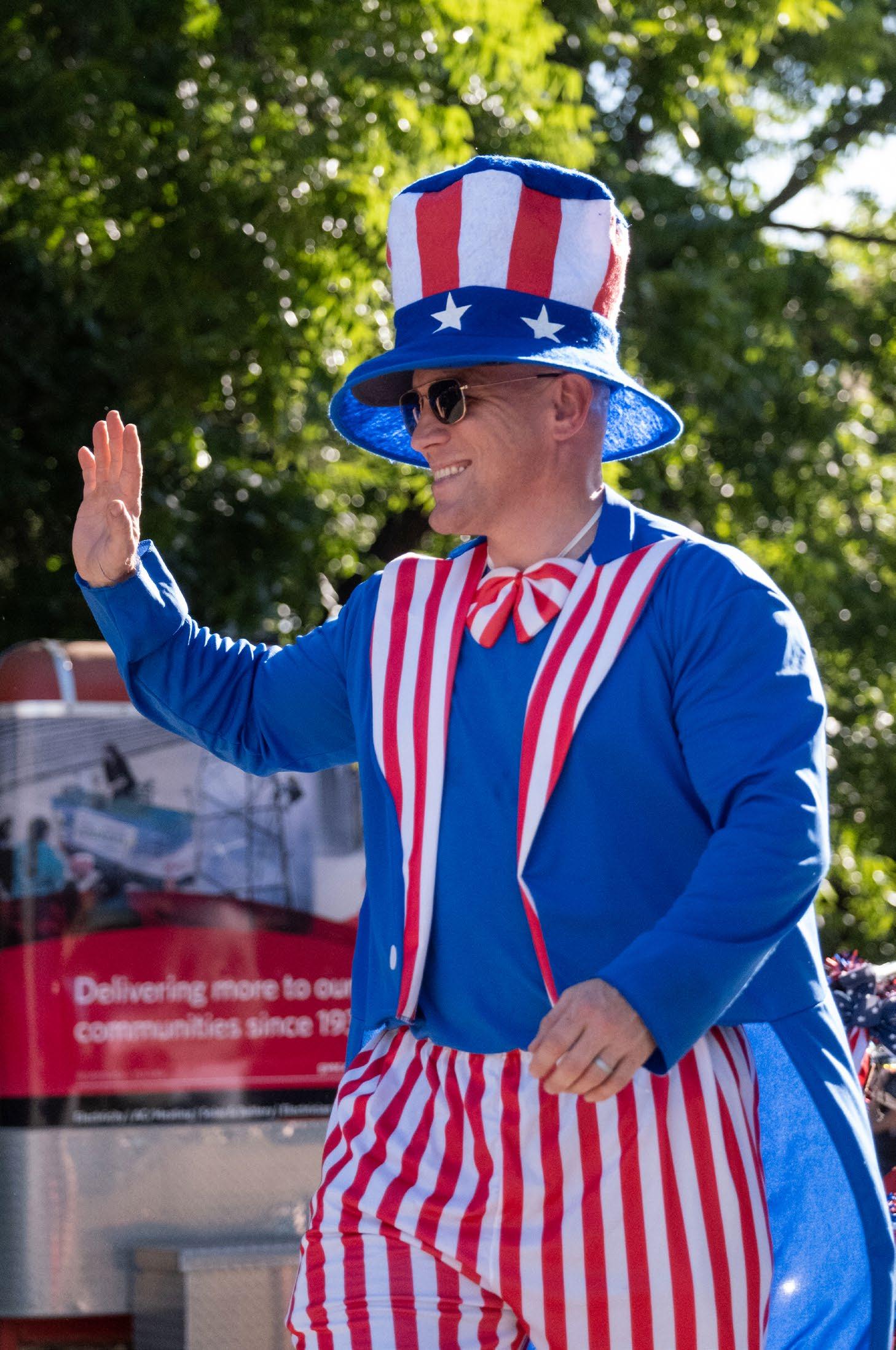 lead a little parade of kids around Central Park. Our first Uncle Sam was Don Richey (former GRMC CEO). He couldn’t do it the next year, so we started asking our elected officials. Our most frequent Uncle Sam has been former State Representative John Kuempel. He was a great sport for so many years. Last year was the first time we ‘deputized’ Sheriff Joshua Ray as Uncle Sam. We are honored that he’s agreed to lead the parade again this year! When we started this event, my children were little. My youngest, a 2025 college graduate, was on a tricycle. At first, we operated this event independently, but for many years, KWED has allowed our event to kick off the Freedom Fiesta and we’ve happily called it home ever since,” Follis said.