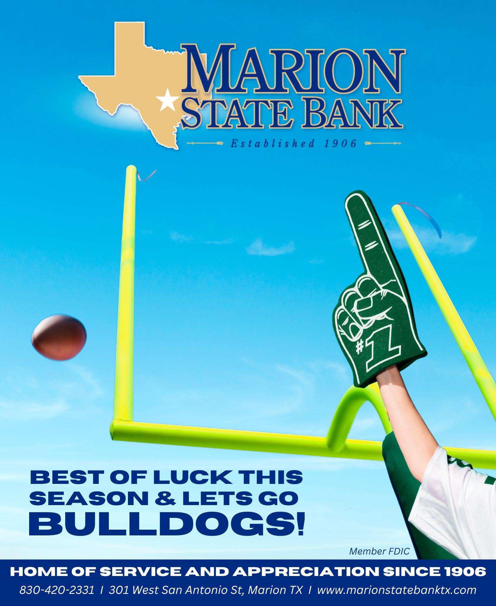 Marion finished the 2024 regular season tied for second in District 13-3A. The Bulldogs then defeated District 14-3A champion Jourdanton in the bi-district playoffs. Marion is bringing back a wealth of experience from last year’s team including senior quarterback Kade Pape.