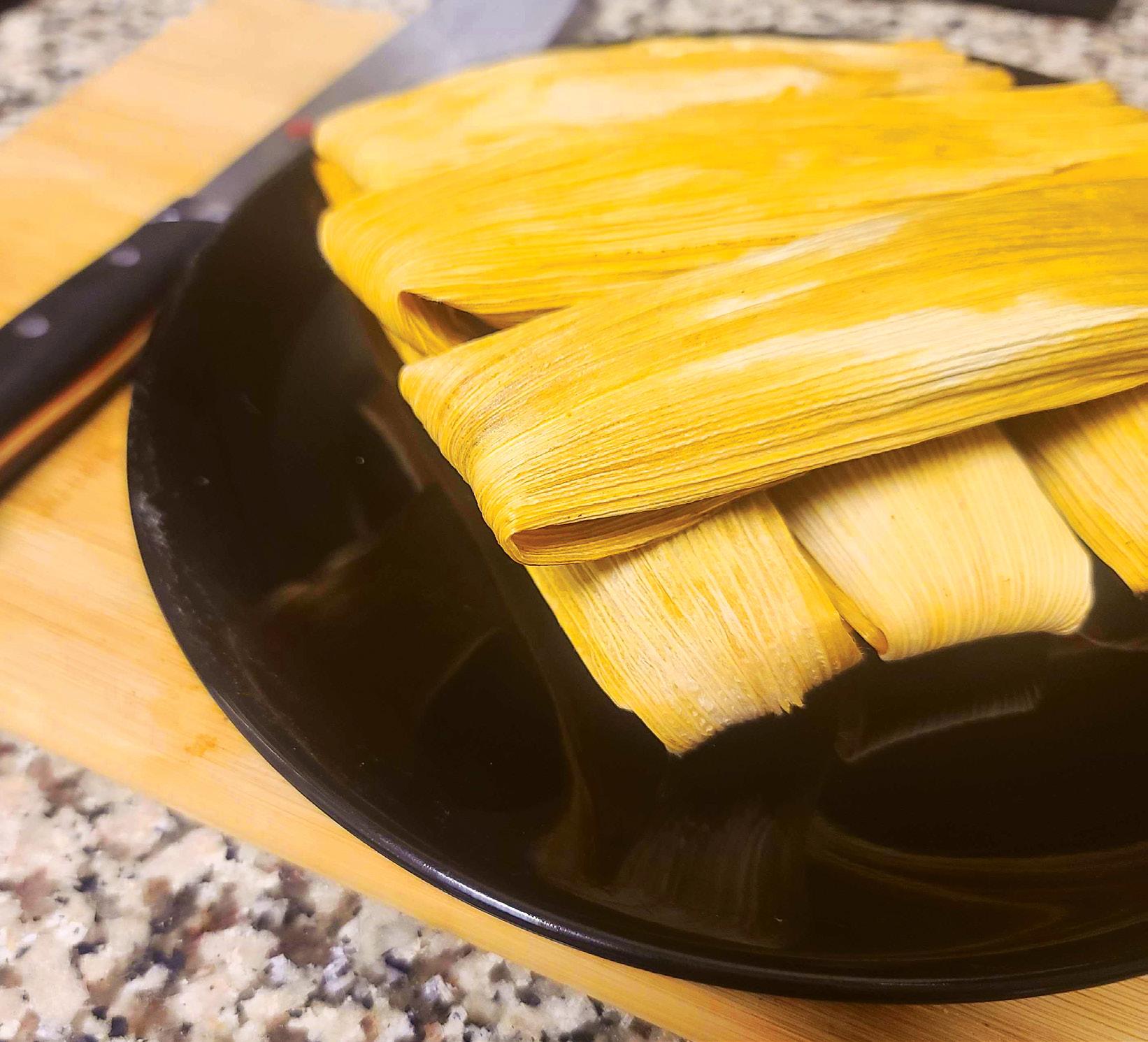 1. Start by soaking the corn husks in water. They typically need to sit for a couple of hours to become pliable enough to work with and that allows plenty of time to get the masa and the tamale filling ready.
