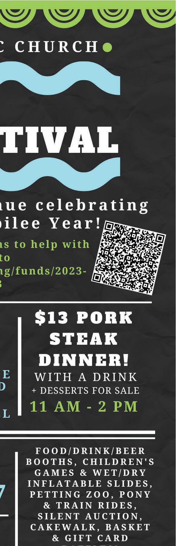Come on out and bring the family to have some fun with St. James Catholic Church! Food, drinks, beer, booths, children’s games, wet and dry inflatable slides, petting zoo, pony and train rides, silent auction, cakewalk, and basket and gift card raffles. Live auction starts in the gym at 12 p.m. Live music - Gacho Sol, Clint Taft & The Buck Wild Band, and DJ Marcus Demel. $13 pork steak dinner 11 a.m. to 2 p.m. Location: St. James Catholic Church, 510 S. Camp St.