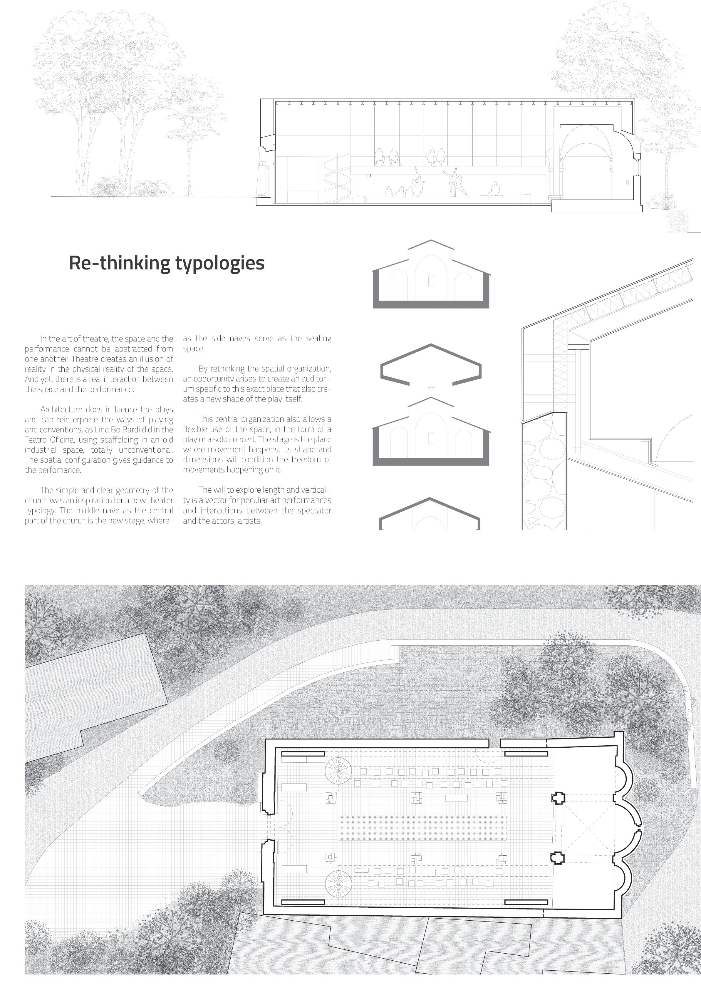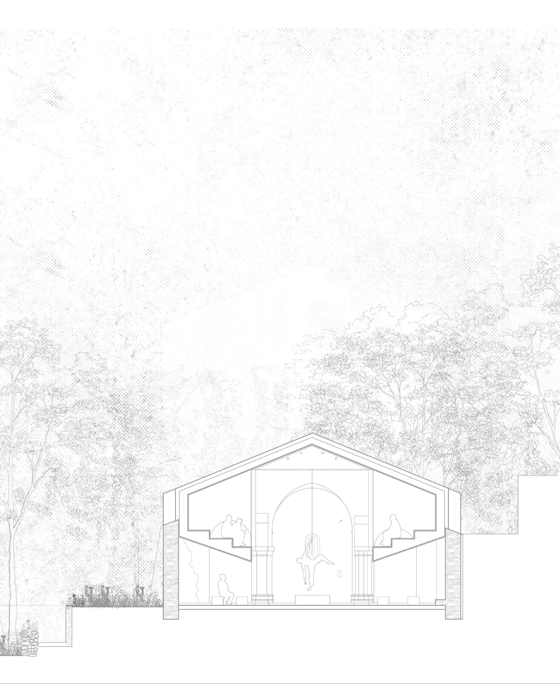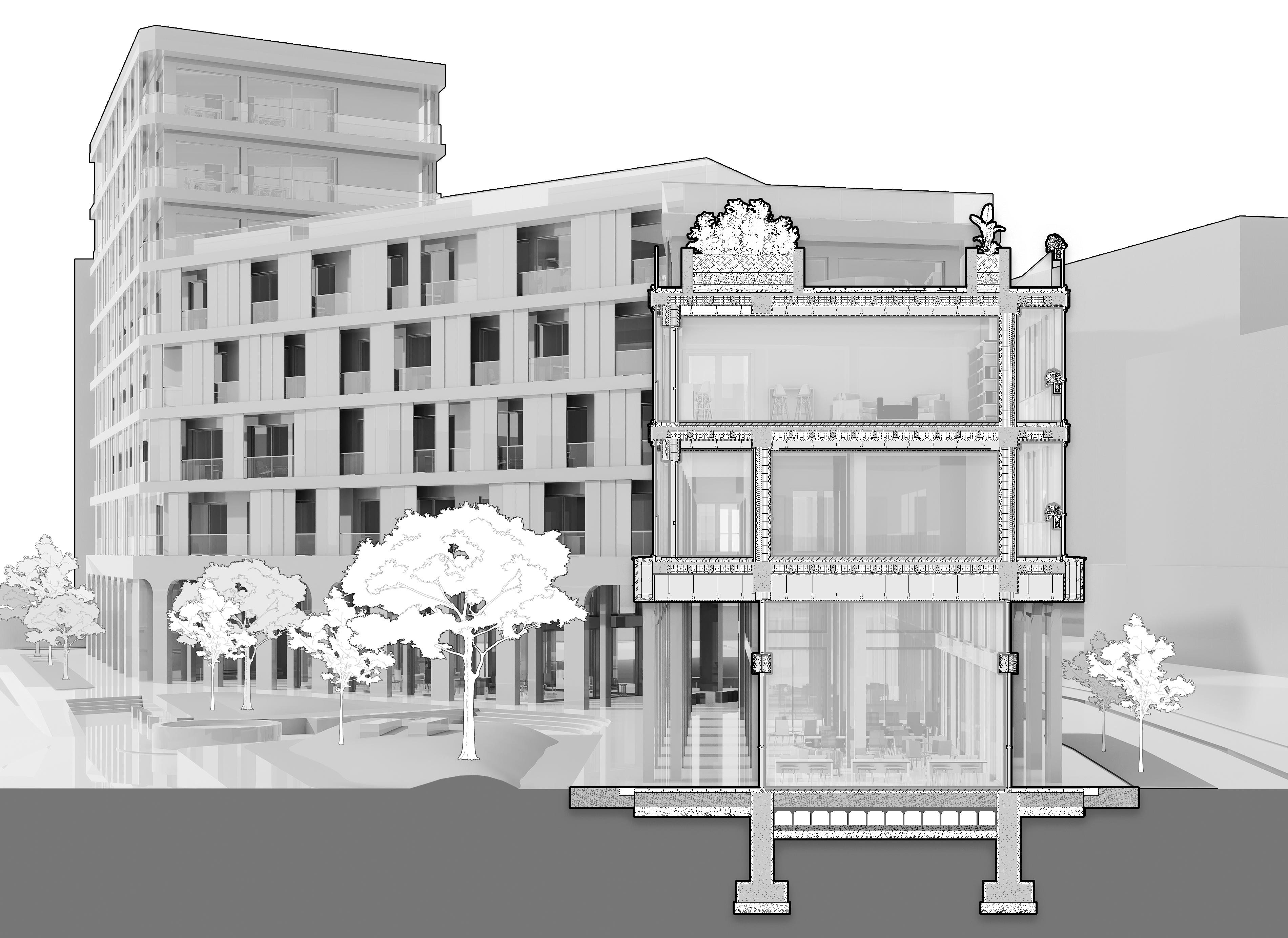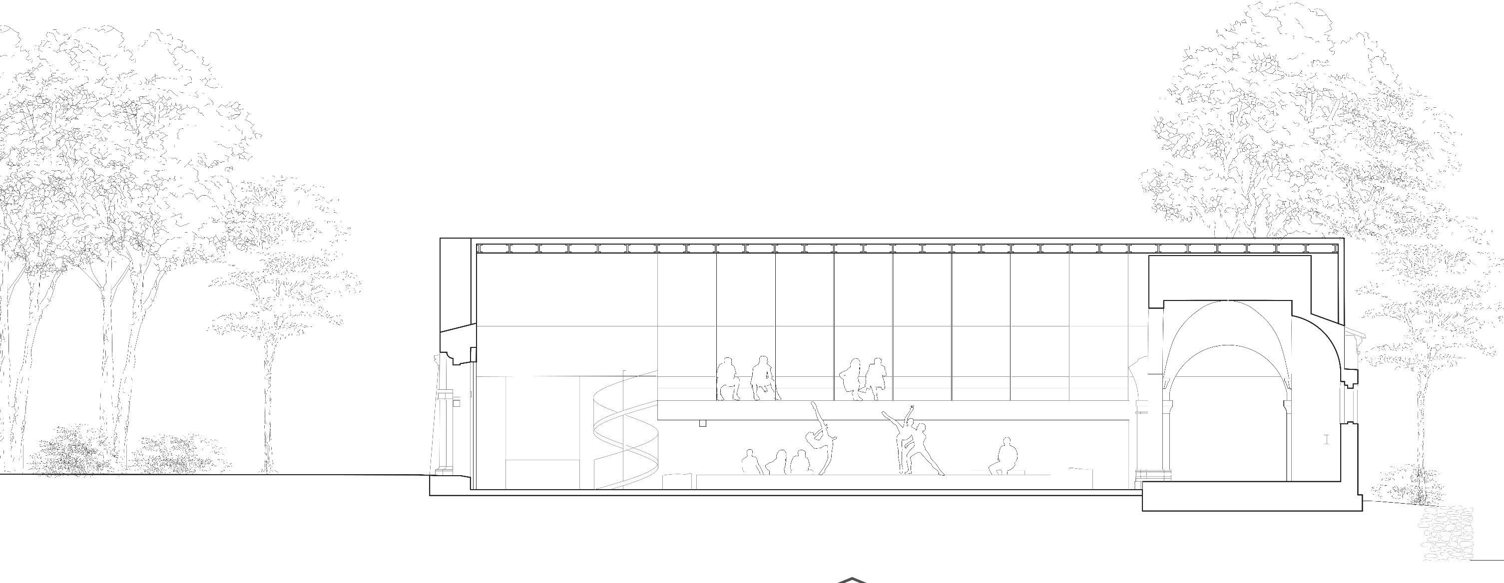 Inspired by the monumental logic of Roman masonry, the structural solution is revealed through highly detailed technical sections.