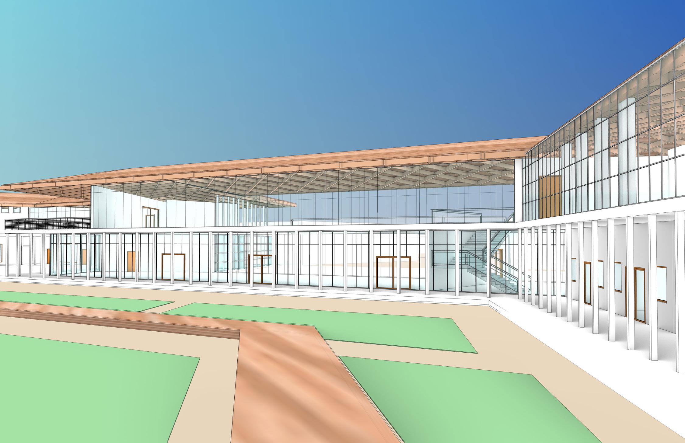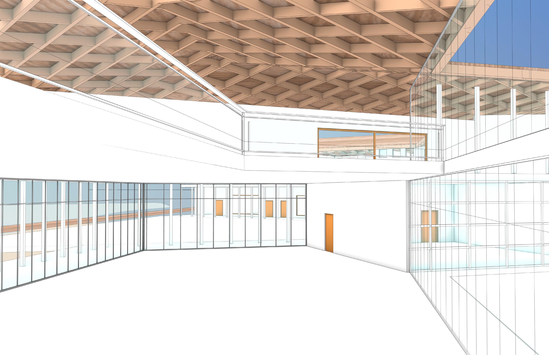 The Central Cooridor has enclosed green attriums with skylights that bring light into the building and allow children to play in nature even during the colder months and in times of rain and snow.