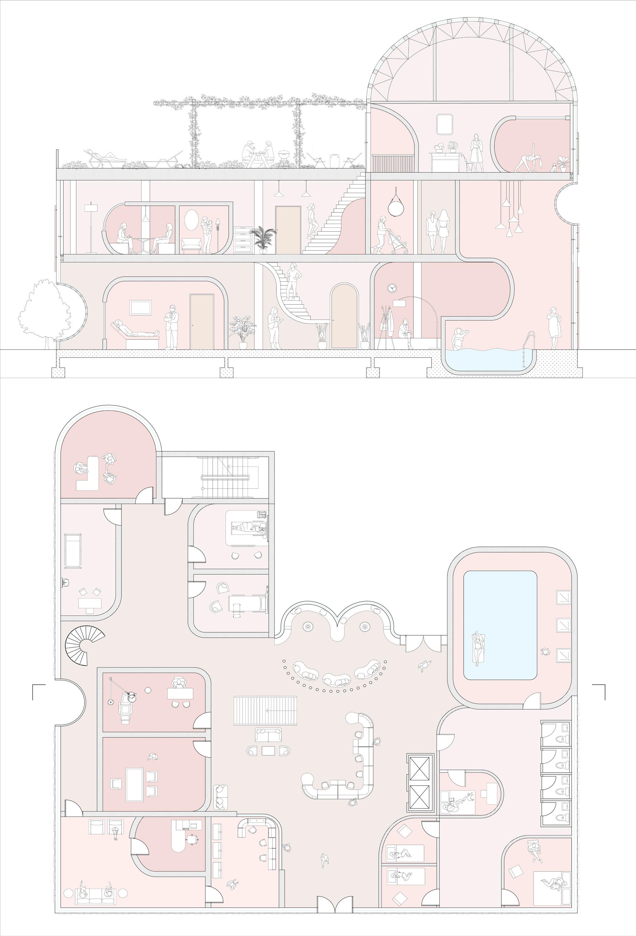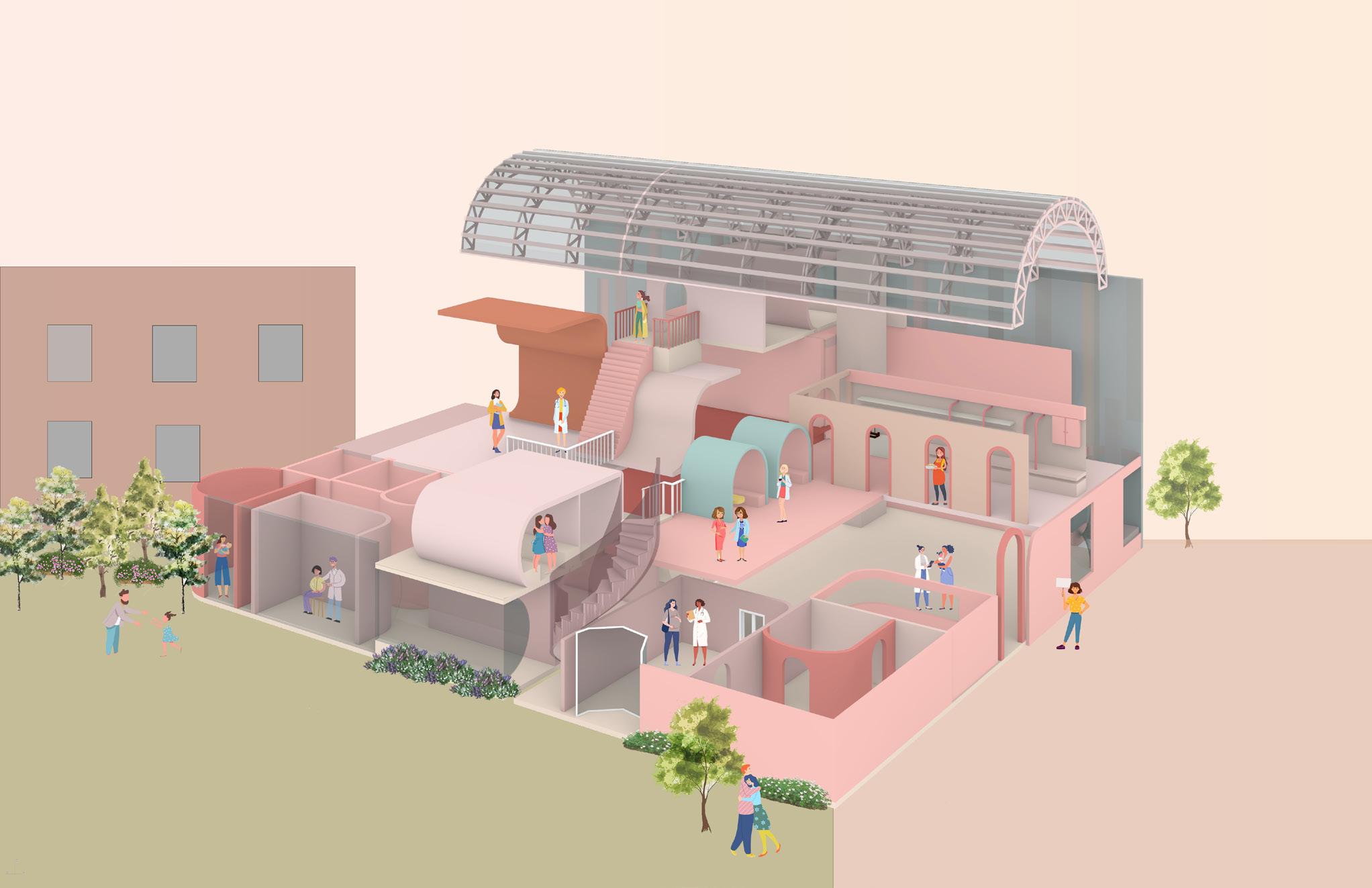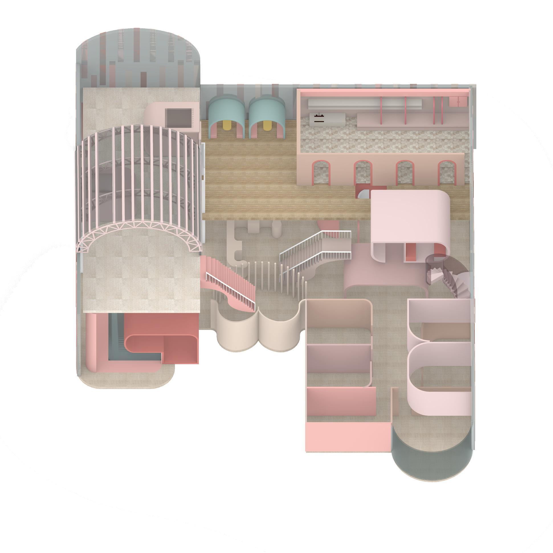 The project prioritizes pre and post medical consultation care as much as the medical procedures themselves. Wellscape is created to be a space that playfully provides wellness, rest and recovery with an all encompassing outlook towards femanine care. Curves and filleted edges soften the space and provide a sense of bodily safety to the users.