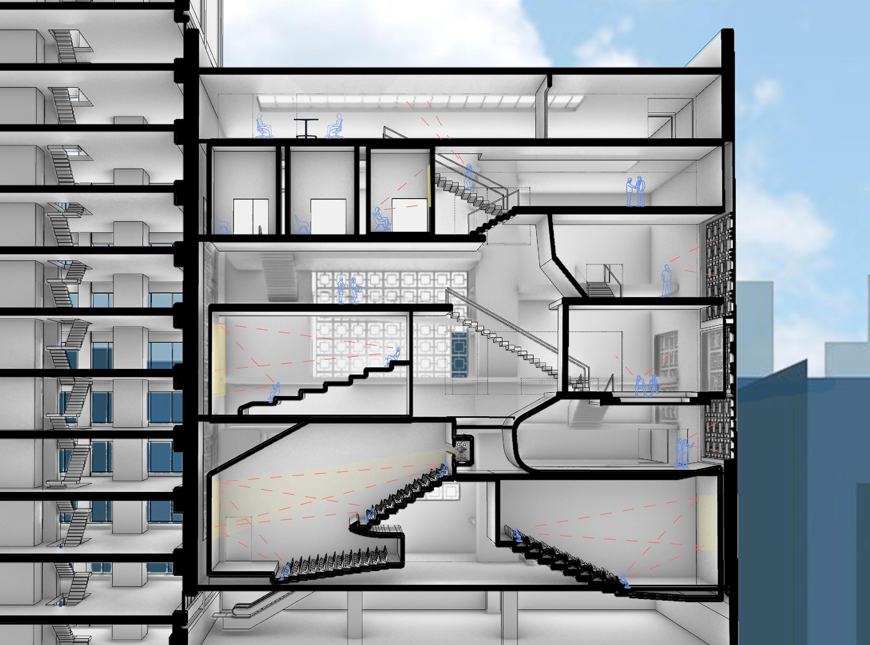 The extension project houses film and visual media rooms at different scales- large cinemas, smaller theaters, individual viewing pods, classrooms and studio spaces. The plan splits the building into two parts with central circulation stairs in the attrium. A glass screen facing the neighboring hunter college building visually connects students and activities in the two building. An outdoor green terrace fascilitates social engagement.
