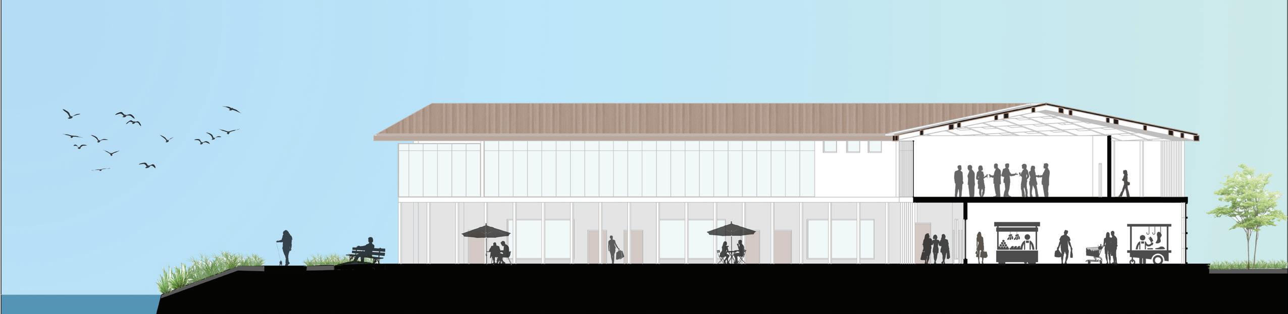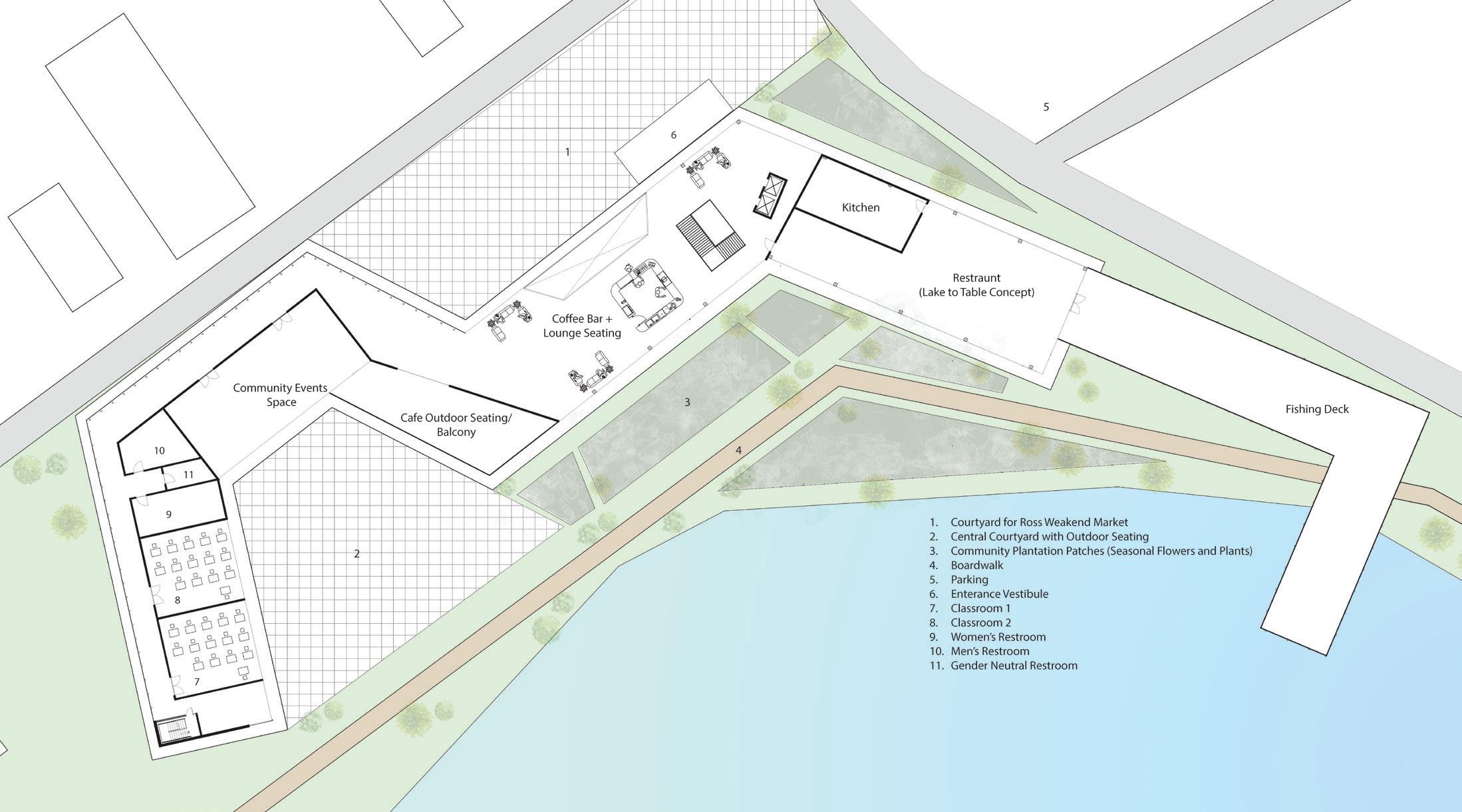 The building has a “zig zag” plan which creates open plazas to host the weekly Ross flea market and provide outdoor seating near the lakefront. In general, the lower floor comprises of retail spaces while the upper floor provides spaces for community engagement- event space, classrooms for language classes, restaurant and café spaces including a deck that opens on the water to allow for tuna fishing.